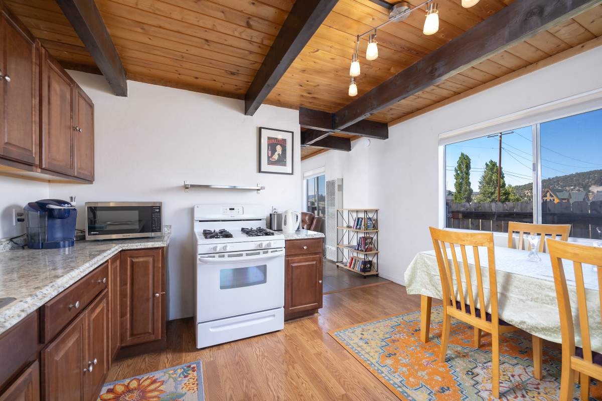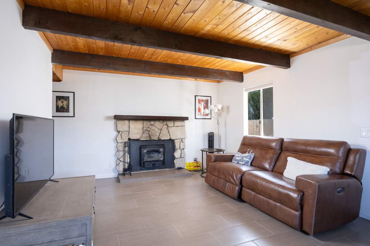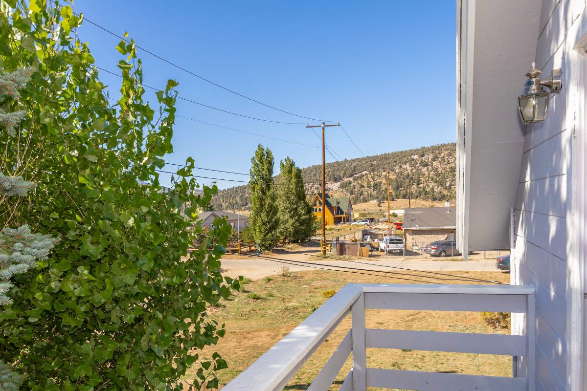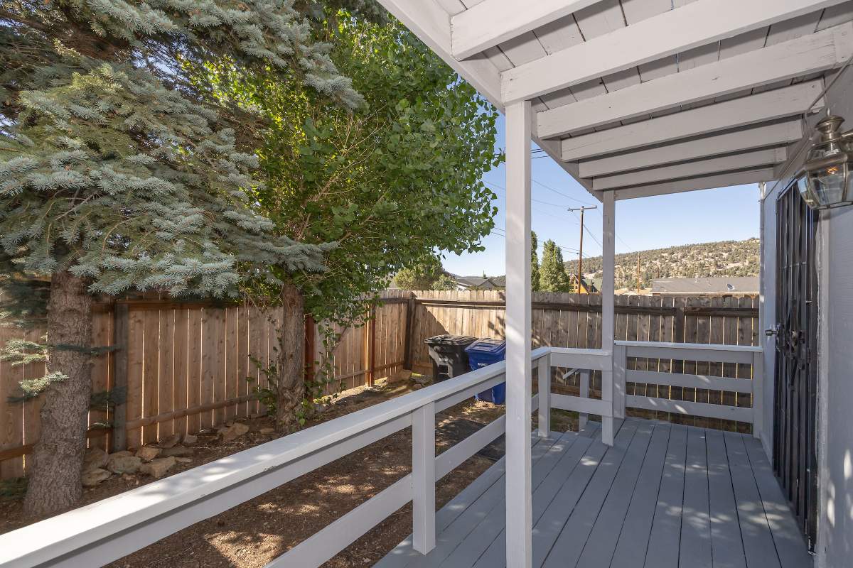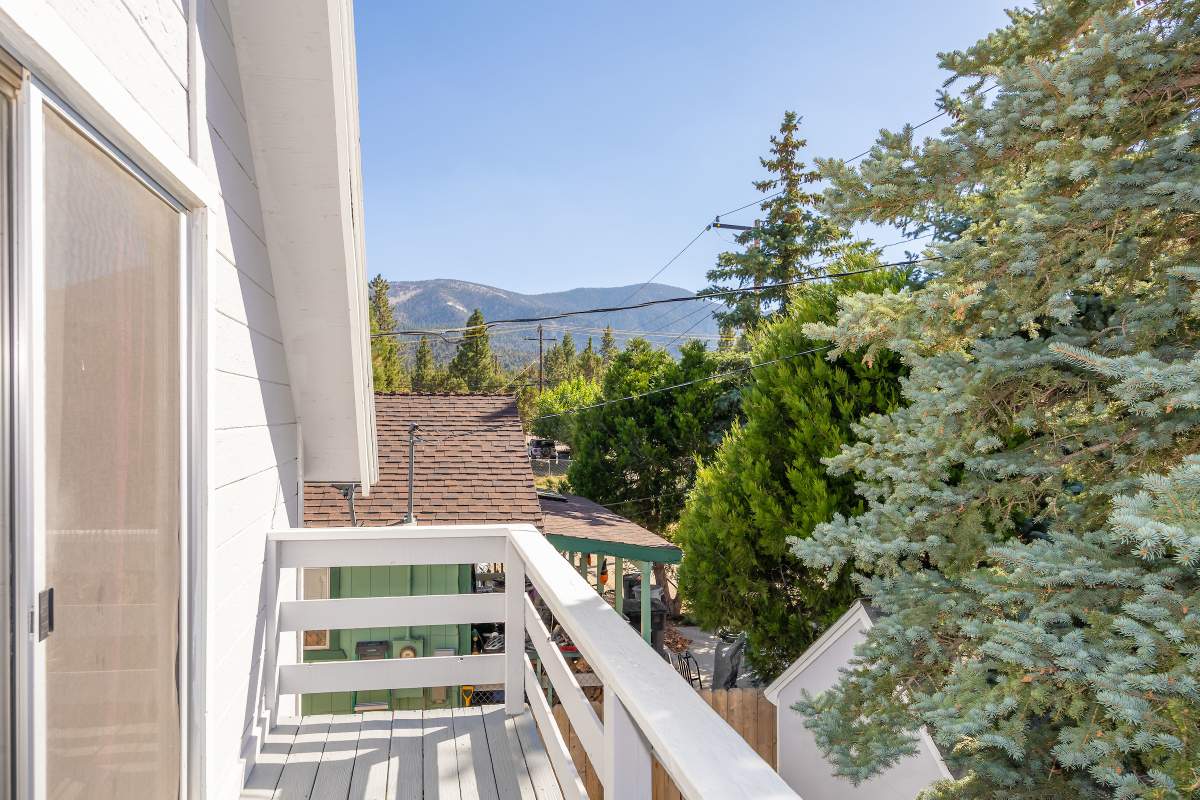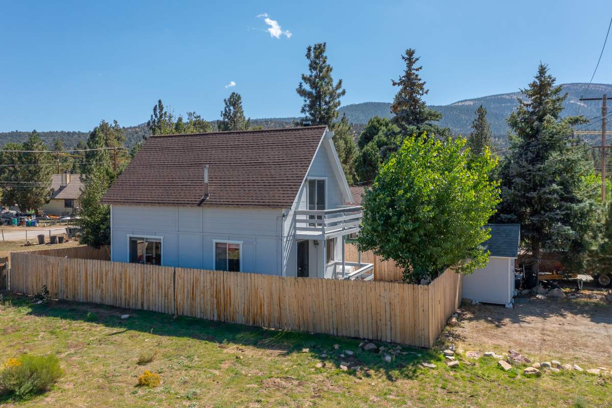 Nice chalet with mountain views, spacious decks on both levels, recently remodeled and painted inside and out. Privacy fenced, adjacent to three vacant contiguous lots, no building to the rear and hidden by tree foliage from the street. The property is being offered fully furnished and includes newer window/patio coverings, light fixtures, outlets/switches, fiber optic internet, modern furniture and appliances. The living room features a beamed wooden ceiling, cozy efficient wood-burning stove with electric blower, mantel, and newer, thermostatically controlled, gas wall heater venting heat to both floors. Modern wood plank-look tile in the living room, hall and both bathrooms. Updated kitchen has wood laminate flooring, pantry, large dining table and patio door accessing the back yard complete with patio set, loungers and natural gas BBQ. The stairs and bedrooms have newer plush carpet installed. All interior doors have been replaced with solid core doors and matching hardware. Both bedrooms have vaulted ceilings, exposed beam, walk-in closets, power reclining beds, remote control ceiling fans and direct access to the full Jack & Jill bathroom. Open ridge line views from the balcony off of one bedroom. Full laundry with storage. Recently installed 8’ X 12’ gable shed with floor and painted to match. Fully furnished and turnkey, ready to enjoy as your mountain getaway cabin and/or income property.