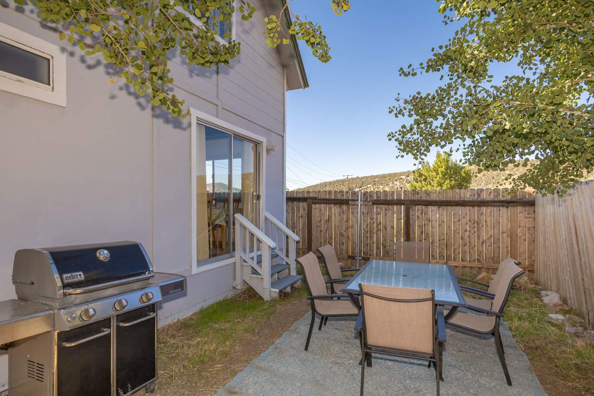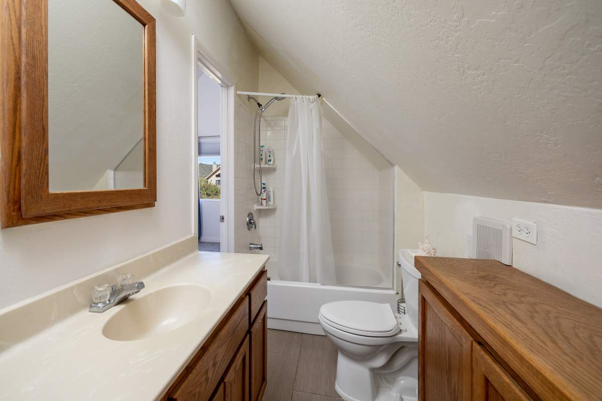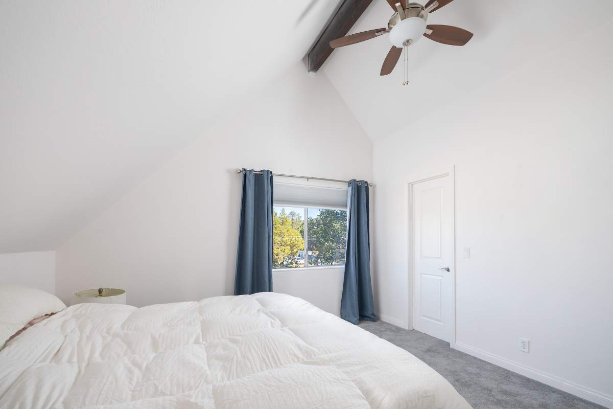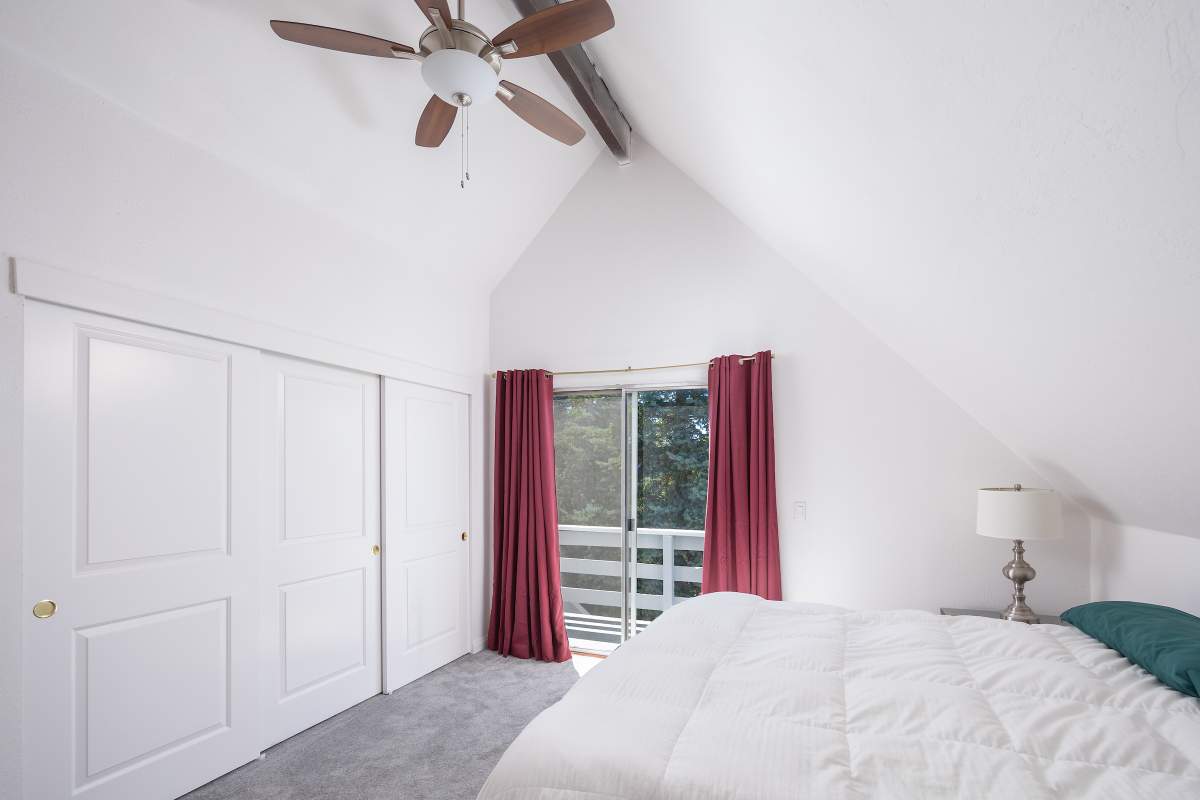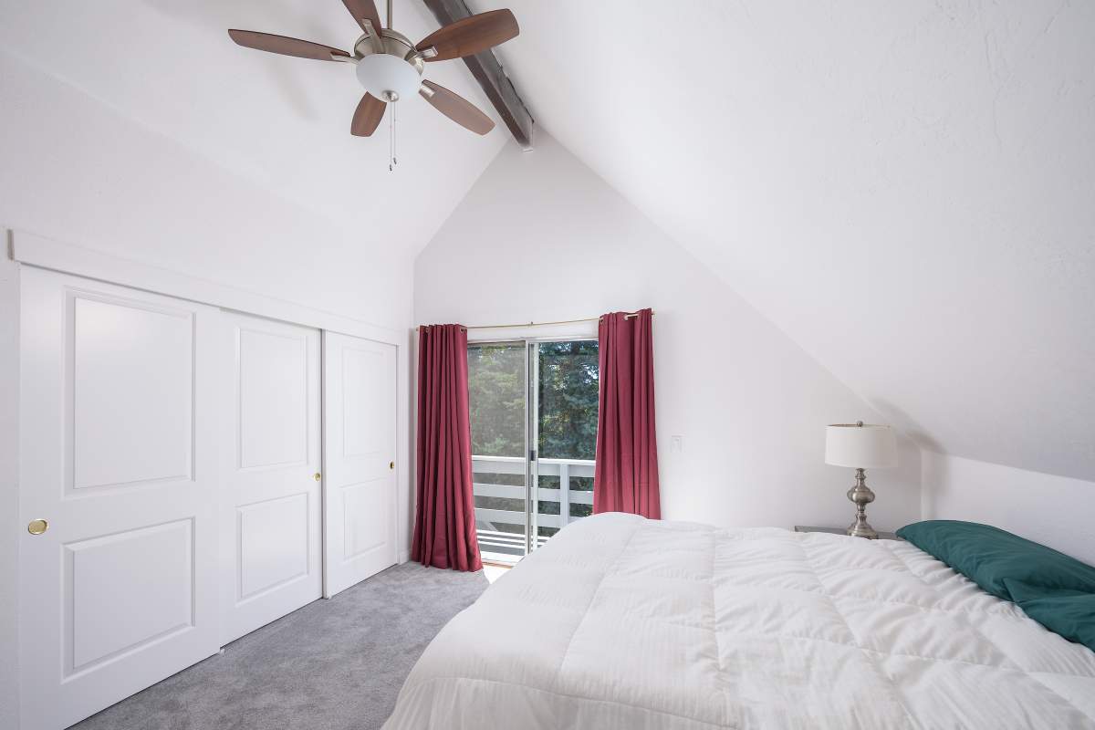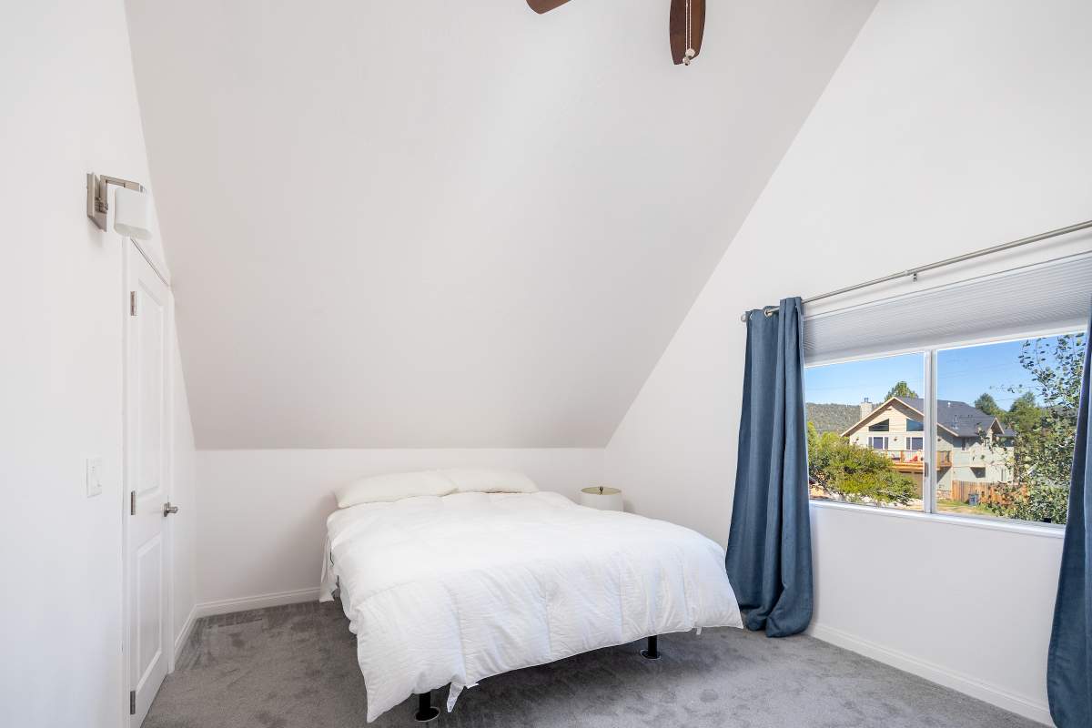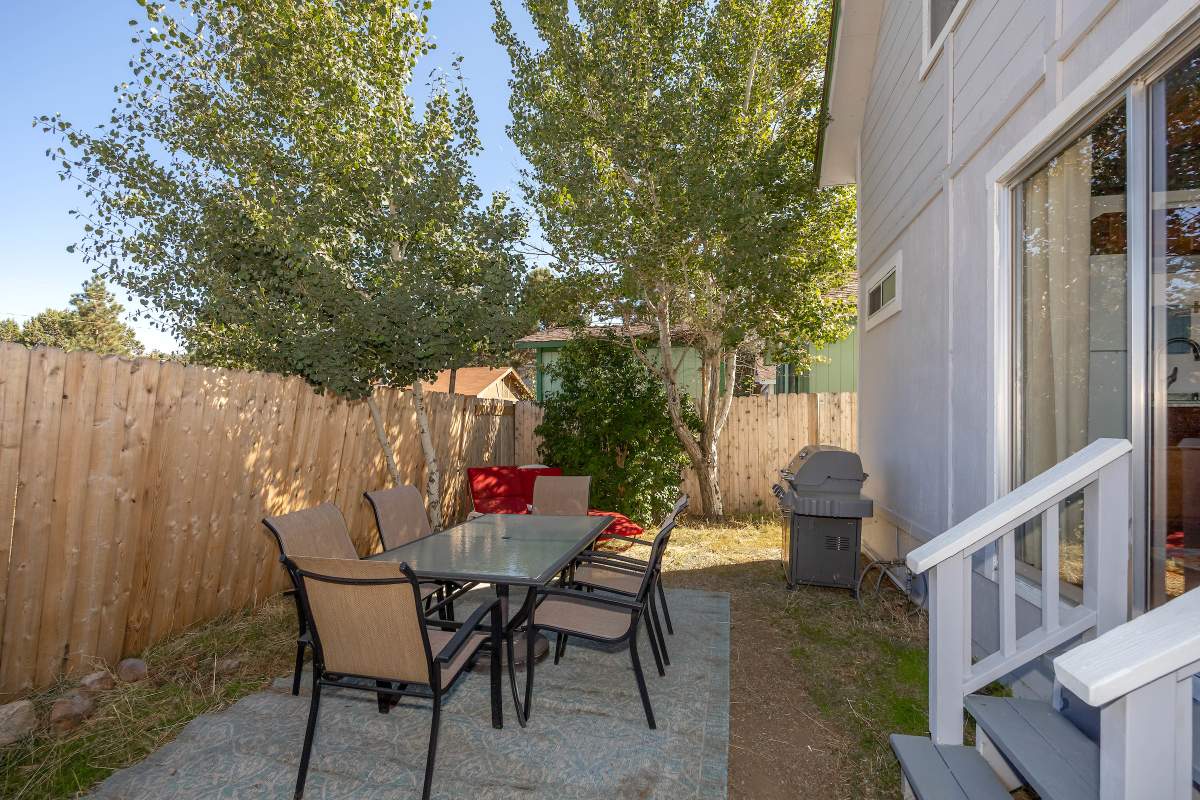 Nice chalet with mountain views, spacious decks on both levels, recently remodeled and painted inside and out. Privacy fenced, adjacent to three vacant contiguous lots, no building to the rear and hidden by tree foliage from the street. The property is being offered fully furnished and includes newer window/patio coverings, light fixtures, outlets/switches, fiber optic internet, modern furniture and appliances. The living room features a beamed wooden ceiling, cozy efficient wood-burning stove with electric blower, mantel, and newer, thermostatically controlled, gas wall heater venting heat to both floors. Modern wood plank-look tile in the living room, hall and both bathrooms. Updated kitchen has wood laminate flooring, pantry, large dining table and patio door accessing the back yard complete with patio set, loungers and natural gas BBQ. The stairs and bedrooms have newer plush carpet installed. All interior doors have been replaced with solid core doors and matching hardware. Both bedrooms have vaulted ceilings, exposed beam, walk-in closets, power reclining beds, remote control ceiling fans and direct access to the full Jack & Jill bathroom. Open ridge line views from the balcony off of one bedroom. Full laundry with storage. Recently installed 8’ X 12’ gable shed with floor and painted to match. Fully furnished and turnkey, ready to enjoy as your mountain getaway cabin and/or income property.