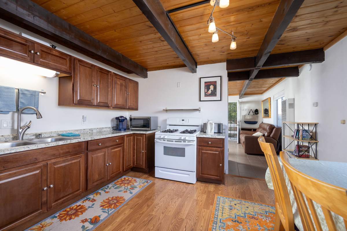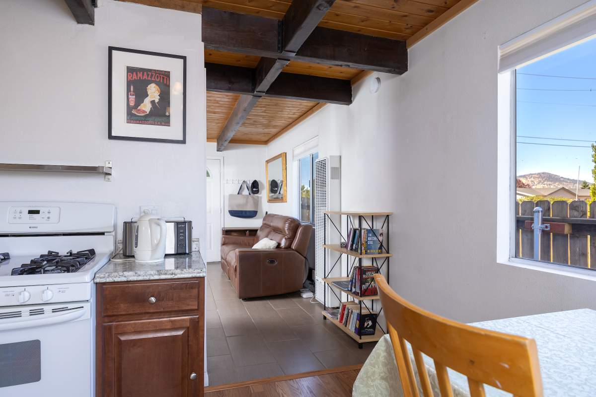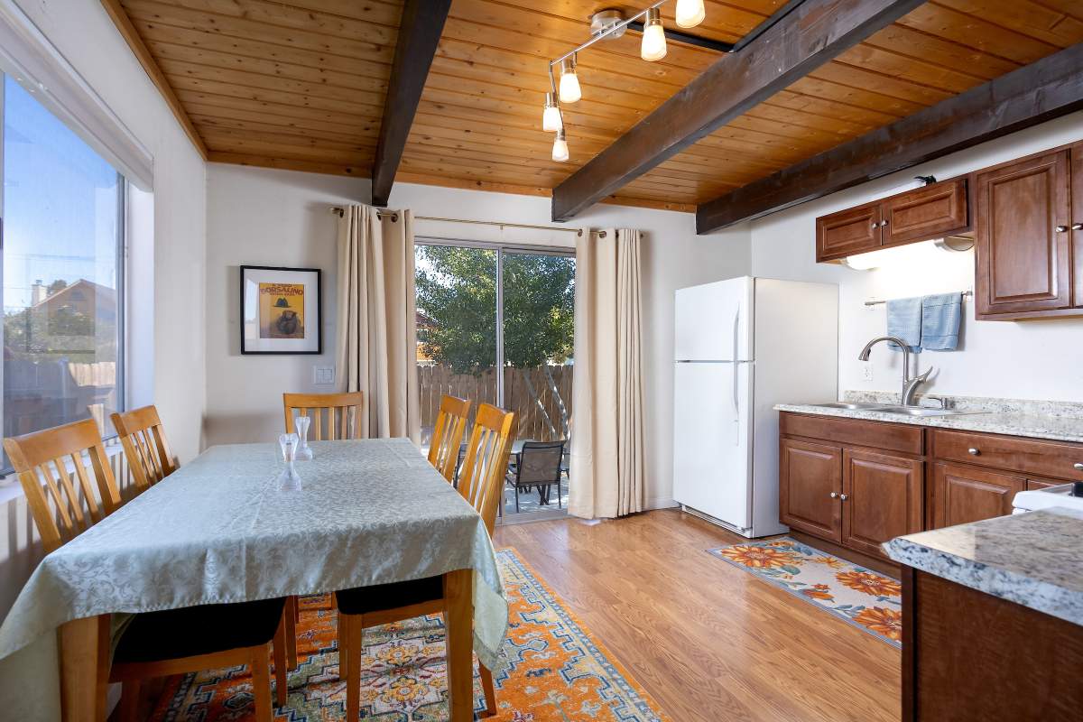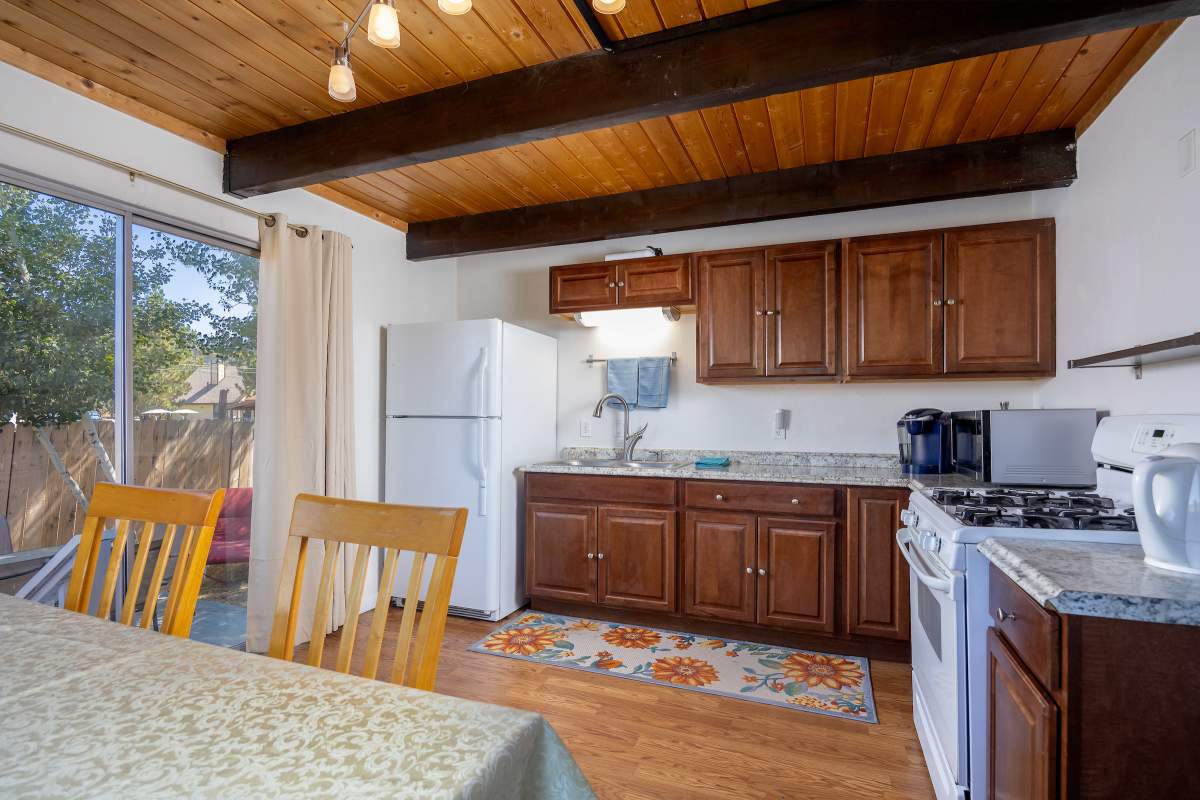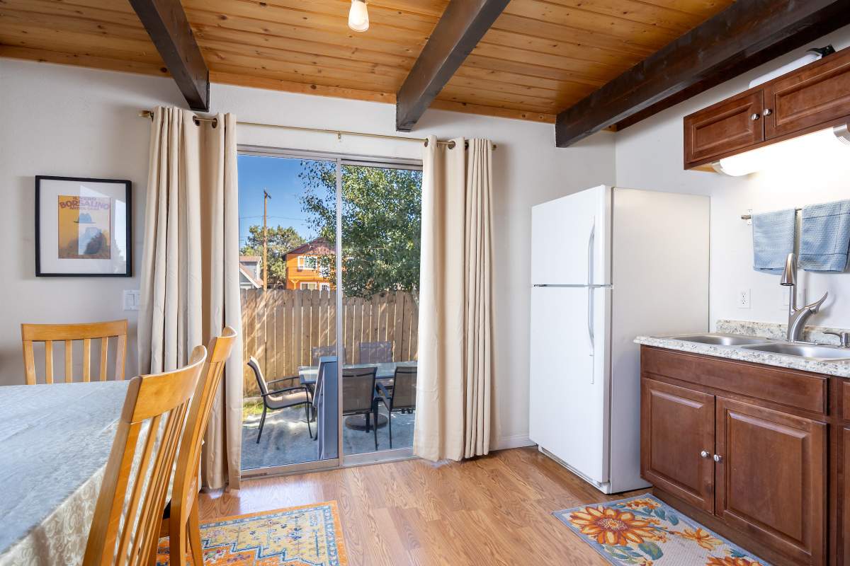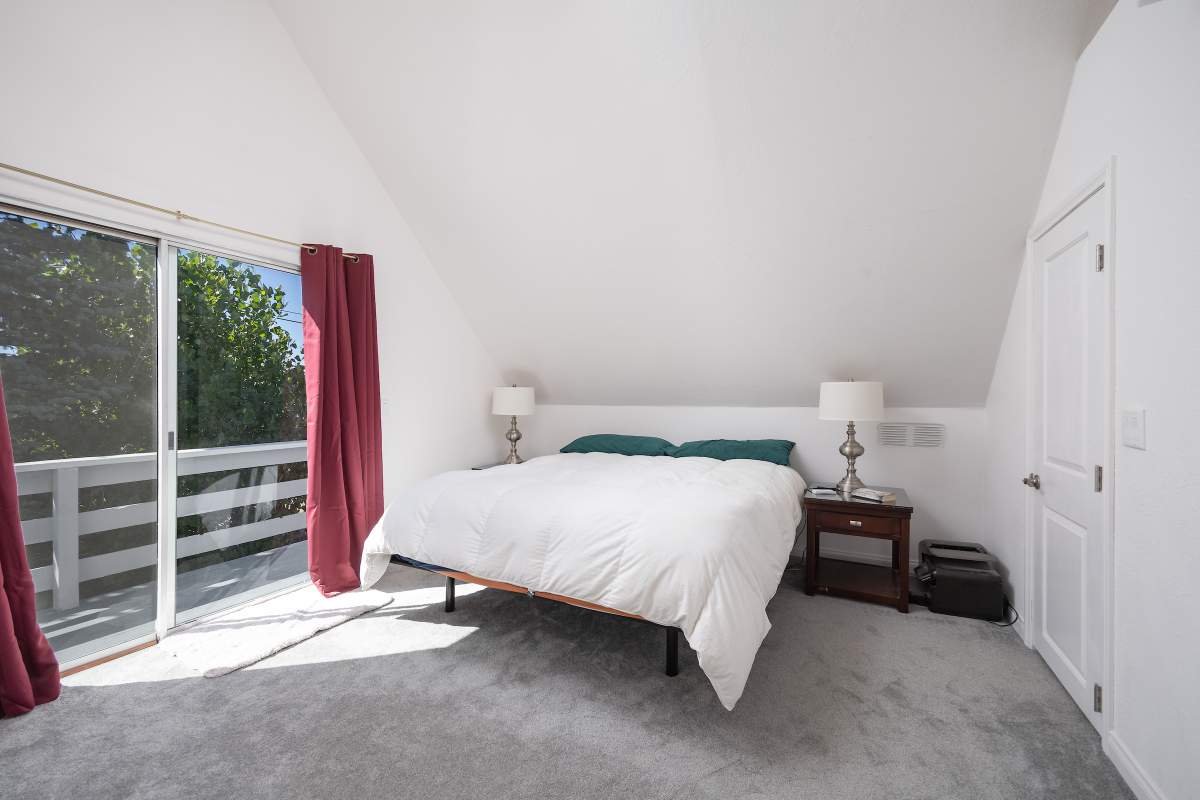 Nice chalet with mountain views, spacious decks on both levels, recently remodeled and painted inside and out. Privacy fenced, adjacent to three vacant contiguous lots, no building to the rear and hidden by tree foliage from the street. The property is being offered fully furnished and includes newer window/patio coverings, light fixtures, outlets/switches, fiber optic internet, modern furniture and appliances. The living room features a beamed wooden ceiling, cozy efficient wood-burning stove with electric blower, mantel, and newer, thermostatically controlled, gas wall heater venting heat to both floors. Modern wood plank-look tile in the living room, hall and both bathrooms. Updated kitchen has wood laminate flooring, pantry, large dining table and patio door accessing the back yard complete with patio set, loungers and natural gas BBQ. The stairs and bedrooms have newer plush carpet installed. All interior doors have been replaced with solid core doors and matching hardware. Both bedrooms have vaulted ceilings, exposed beam, walk-in closets, power reclining beds, remote control ceiling fans and direct access to the full Jack & Jill bathroom. Open ridge line views from the balcony off of one bedroom. Full laundry with storage. Recently installed 8’ X 12’ gable shed with floor and painted to match. Fully furnished and turnkey, ready to enjoy as your mountain getaway cabin and/or income property.