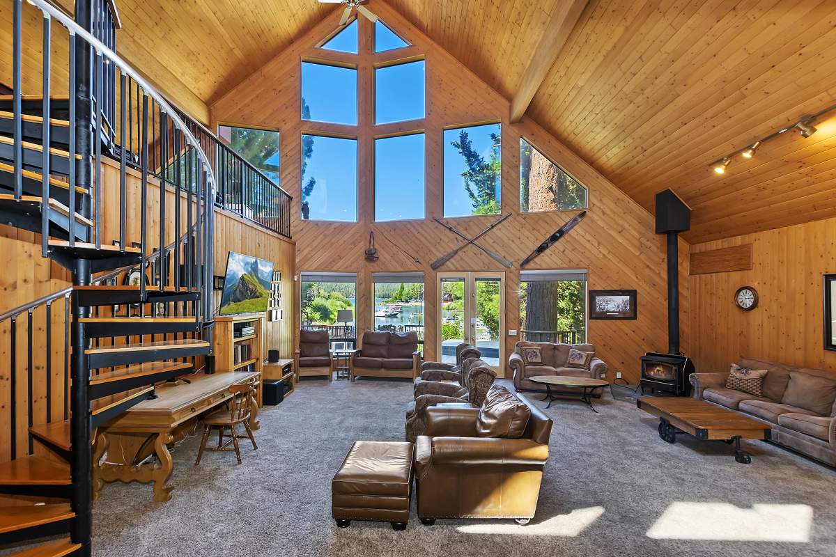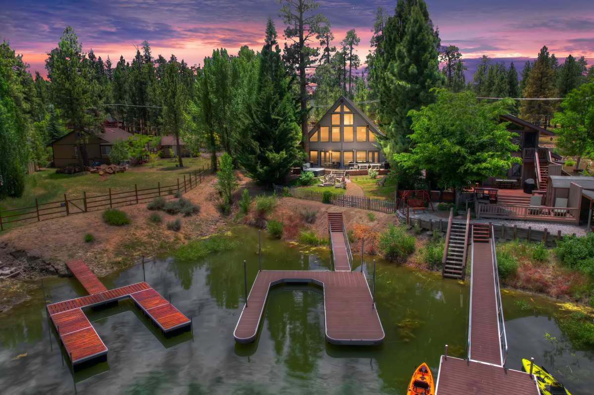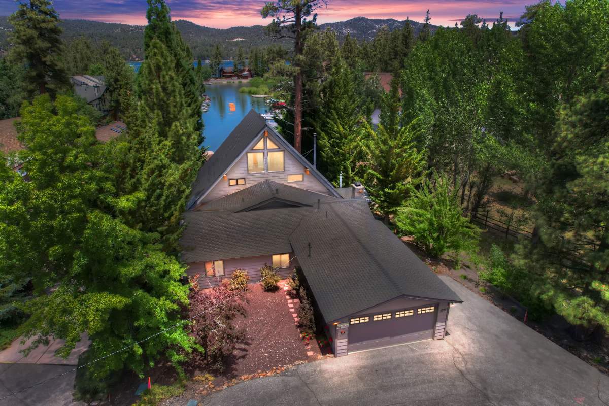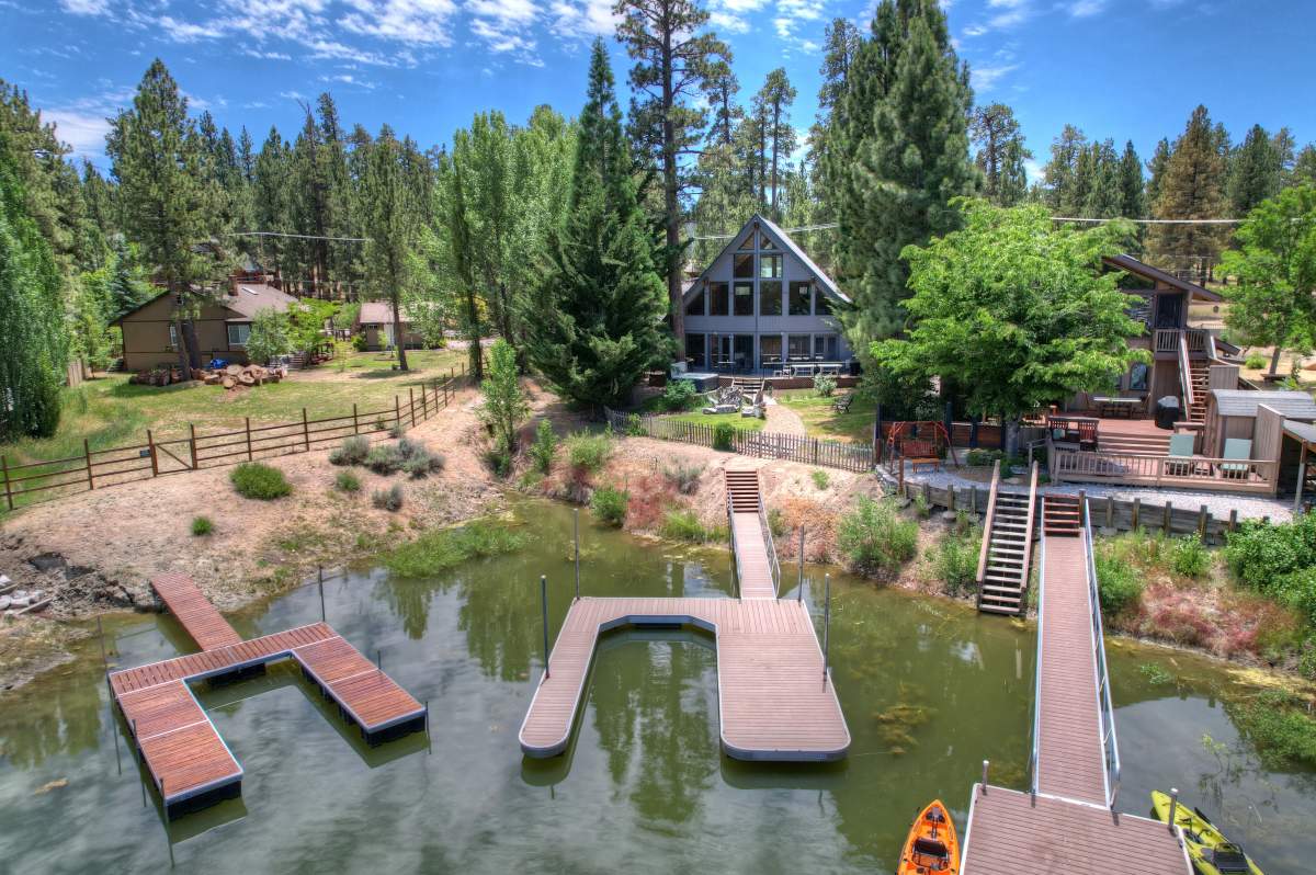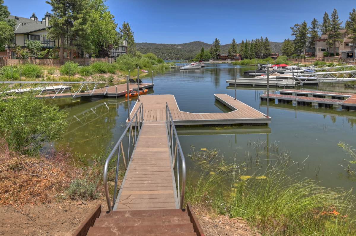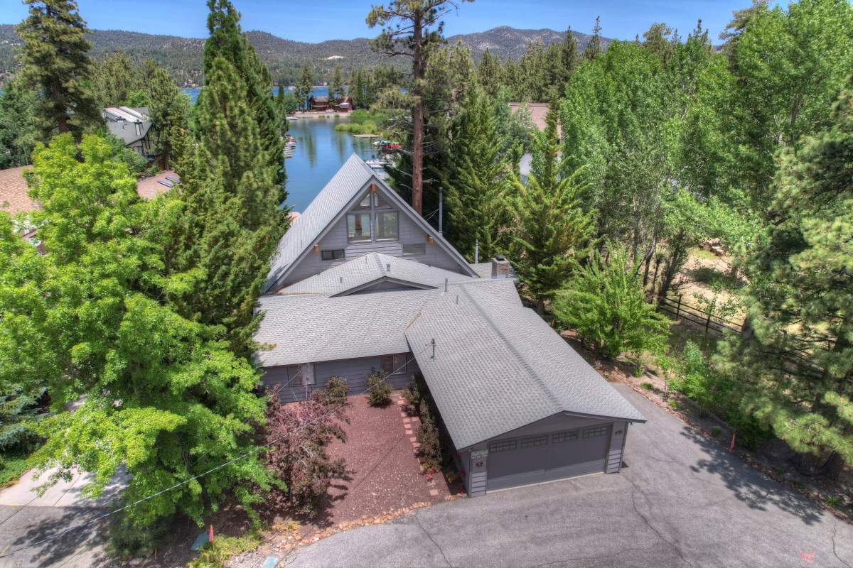 Live the lakefront lifestyle in beautiful Big Bear Lake. This tastefully updated chalet-style home has it all. The impressive great room boasts soaring cathedral ceilings, abundant wood T&G, a wall of windows and french doors that open to the sunny back deck and landscaped back yard. Designed for entertaining, the living areas flow together and include a formal dining area with a native rock fireplace. Kitchen has been updated with granite and stainless. Relax or play in the loft are which has a new slate pool table and great views of the lake. 4 bedrooms and 3 full baths, including 2 master suites, all on the main level, allow room for a crowd and easy access. Over $100,000 worth of improvements over the last few years including all new carpet and tile throughout (except kitchen), new 50-year GAF Golden Pledge roof installed in 2020, new garage door, new natural gas BBQ, new spa, new furniture in all bedrooms and living room, new window blinds throughout, new forced air unit (two FAUs efficiently heat the whole house), updated landscaping. Garage has been modified with a taller door and a deeper section for boat storage (currently houses a 23-foot wake boat). Included is the quality custom dock and gangway with aluminum frame, Trex deck, and new stairs built this year. Go take a look – this turnkey property is ready for you to start making your lakeside memories today.