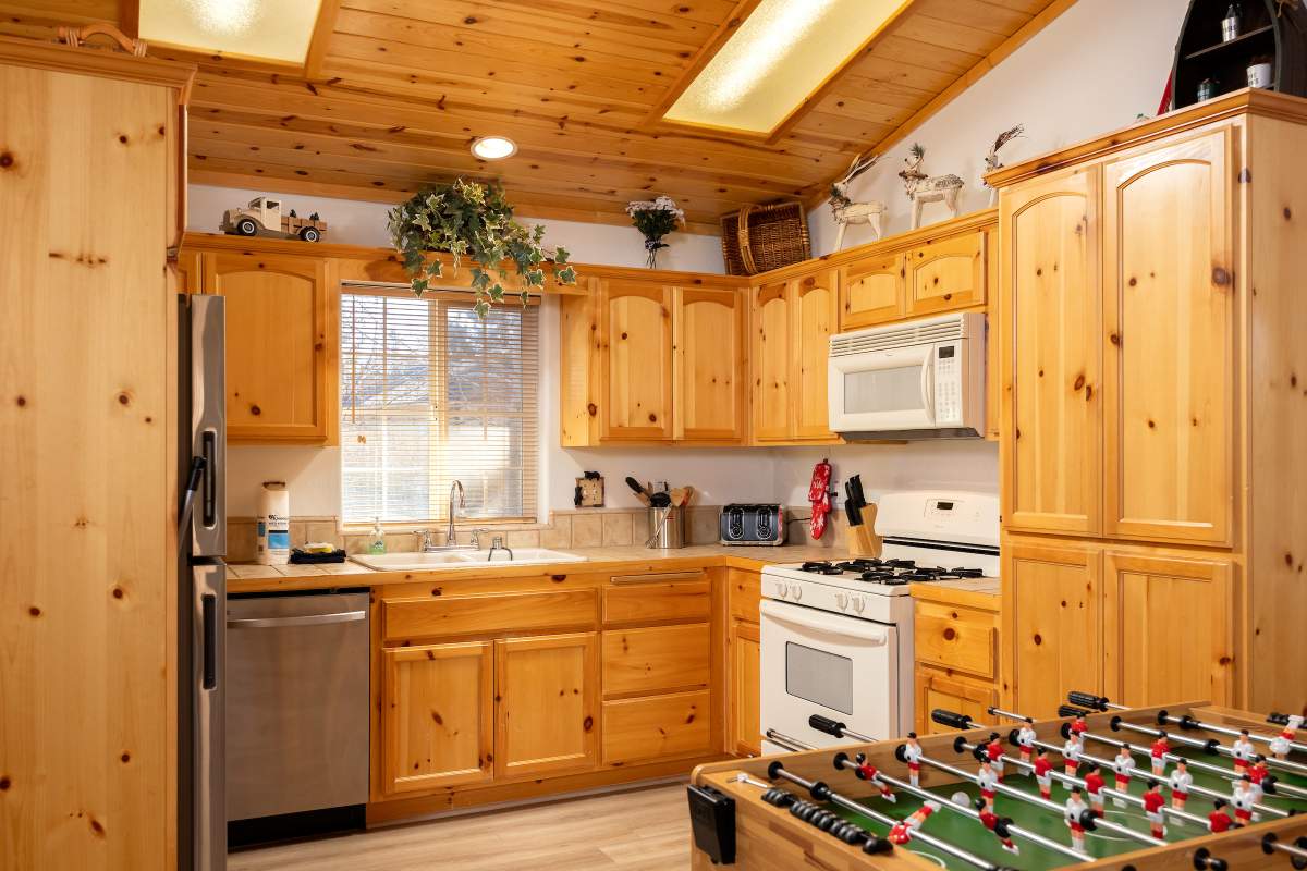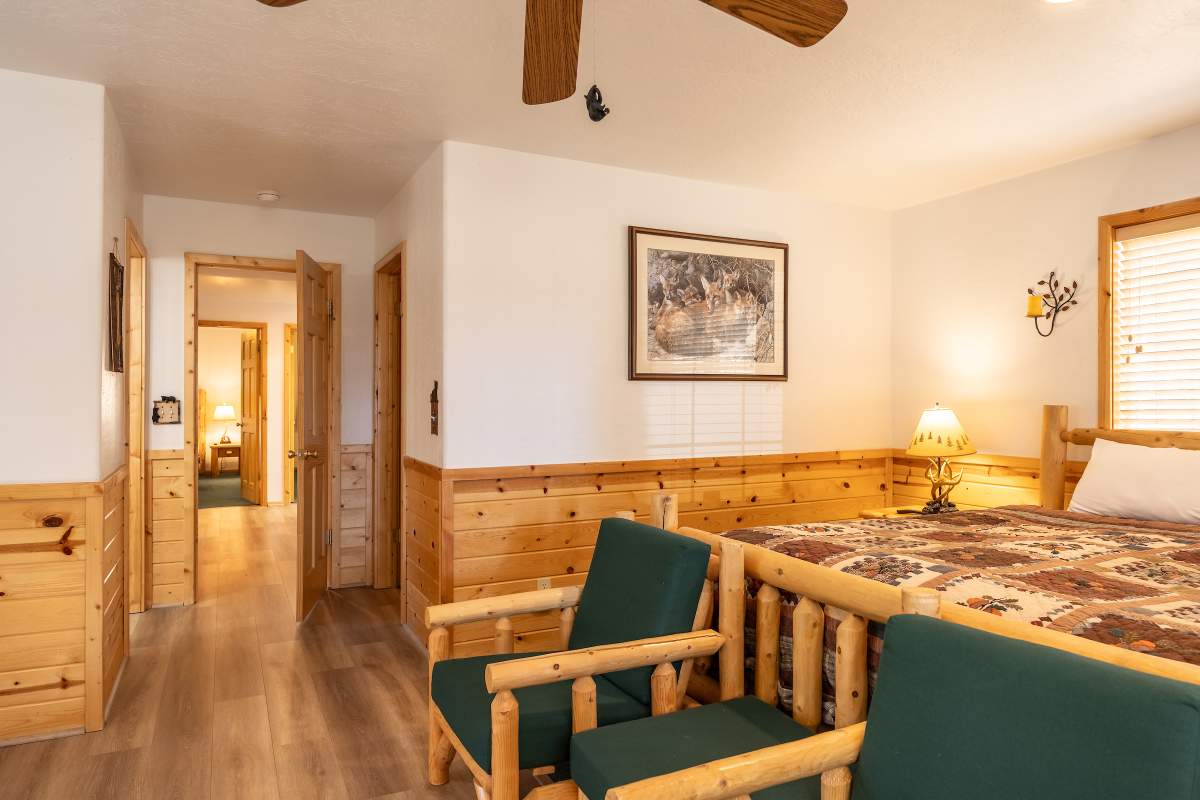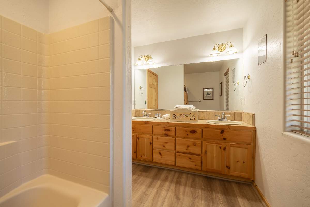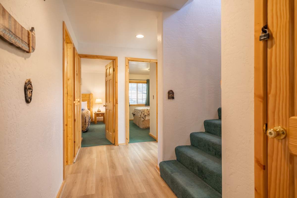 Charming log-style cabin nestled in the pines with beautiful mountain views in the serene Whispering Forest neighborhood. Light & bright interior with beamed ceilings, wood T&G, log accents, and wood laminate flooring. Open great room style main level with a cozy river rock fireplace and wainscoting. Kitchen has custom cabinetry, recessed lighting, and adjacent and dining area. Half bath on the main level. Lower level has 3 bedrooms and 2 baths, including a master suite with access to a private lower deck. Central forced air heat, A/C, separate laundry room. Fenced yard. Easy all-season access level entry and parking in the attached garage and sunny driveway. Enjoy peace and quiet off the beaten path with few passers-by, yet just minutes to town, ski slopes, and the lake.