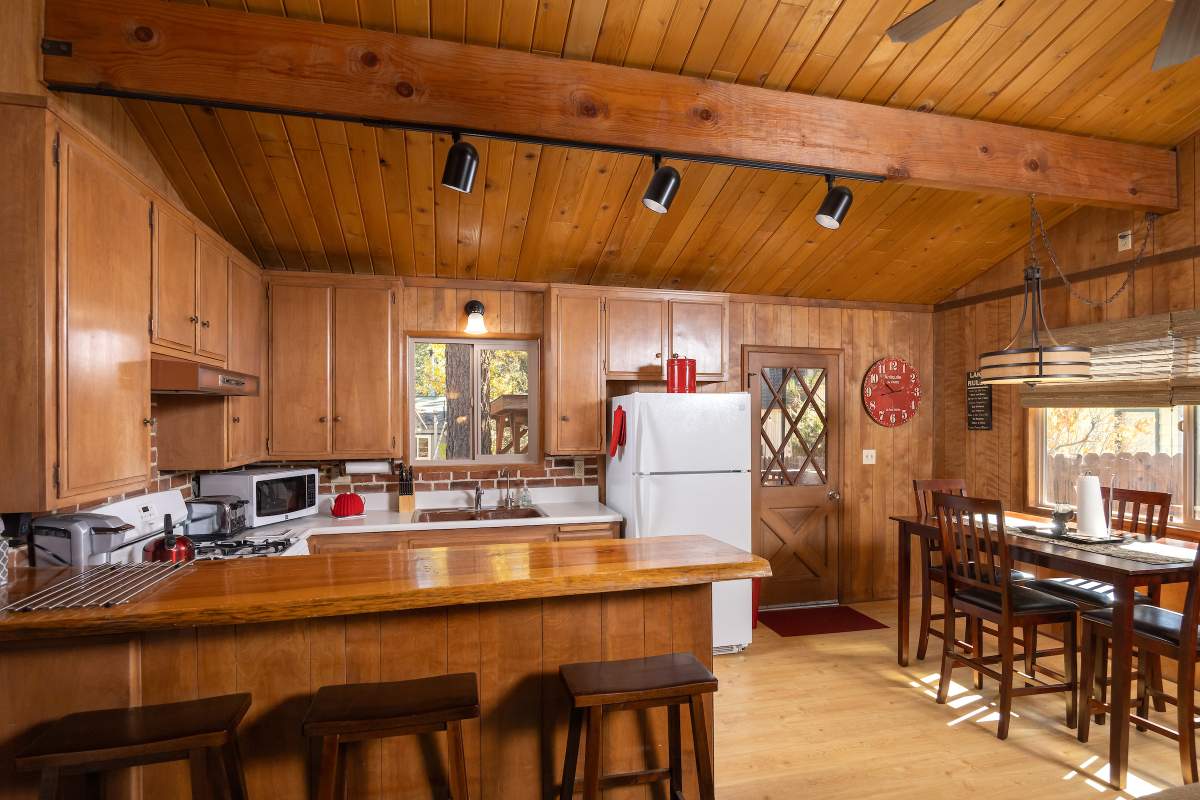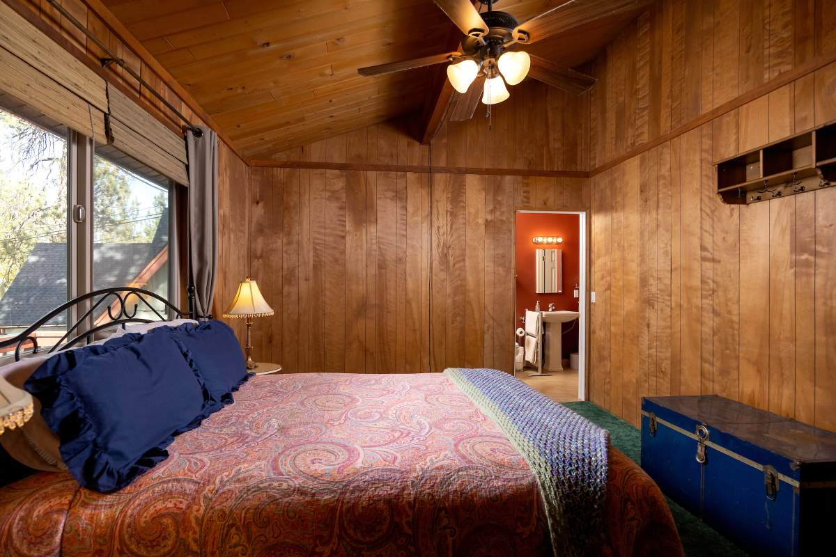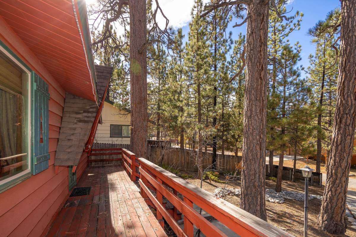 Charming classic sierra-style cabin perfectly located near the lake, ski slopes, shopping, and everything else Big Bear has to offer. Nestled amongst the pines on a fenced lot, this easy access single-level cabin is situated above the street affording a feeling of peace and privacy. Enjoy outdoor living out on the front porch and back deck with an additional covered sitting area in the inviting back yard. Large finished storage shed with electric presents multiple use options. Inside the cabin you are welcomed to an open floor plan with vaulted beamed ceilings throughout, and a cozy brick fireplace in the living room. The kitchen has a wood slab breakfast bar, plenty of cabinetry, laminate flooring, and adjacent dining area. Two bedrooms, two baths, one en suite with remodeled 3/4 bath and attached laundry room. Energy efficient items include central forced air heat, tankless water heater, and dual pane windows. This one won’t last!