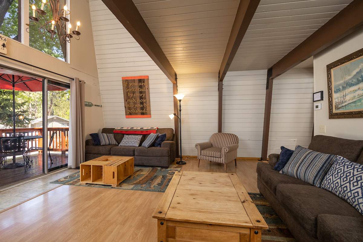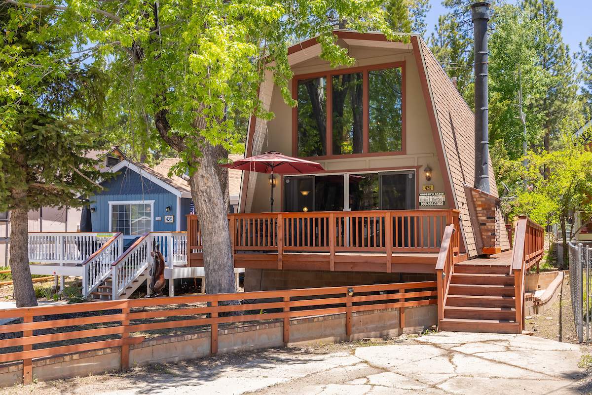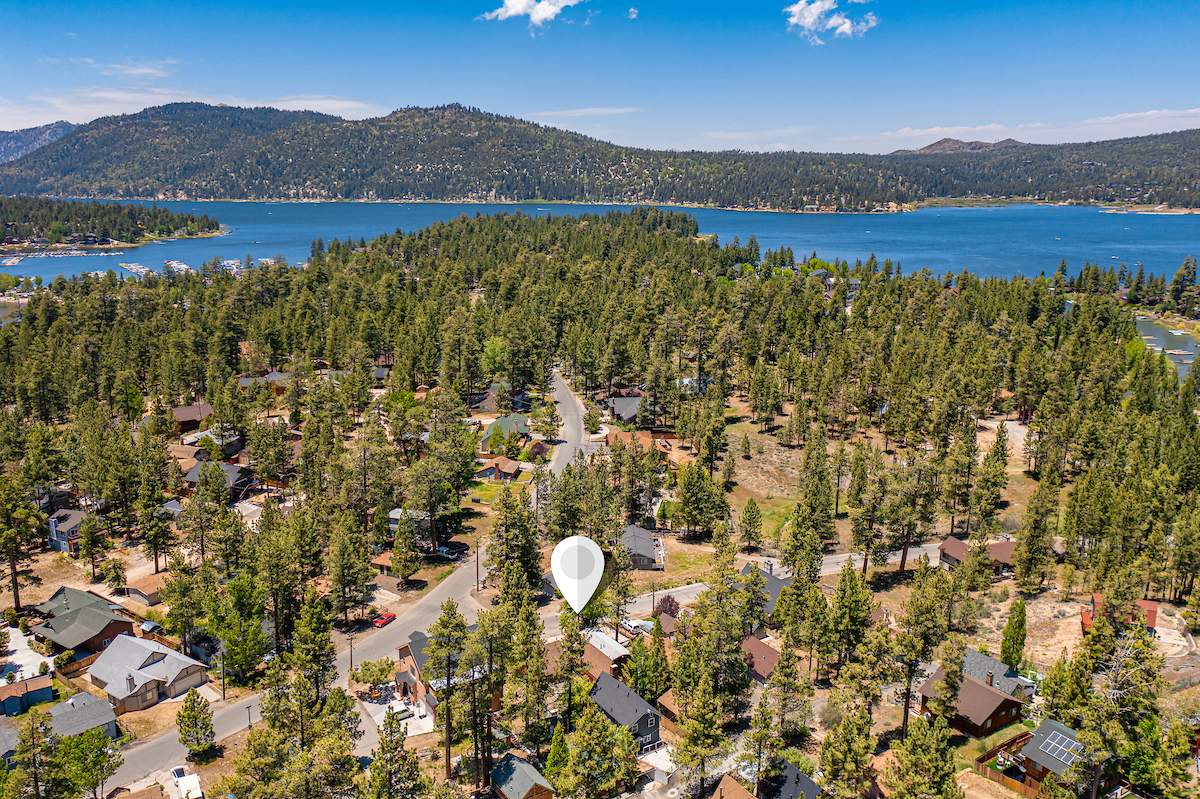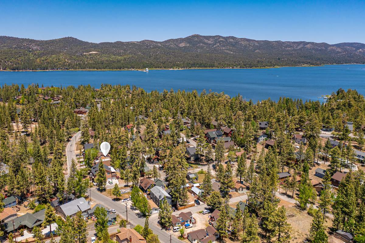 Awesome central Big Bear Lake location so close to the lake and less than one mile from the village. Popular full-roof gambrel-style cabin featuring high beamed ceilings, a cozy brick fireplace, and laminate flooring. Eat-in kitchen with all the amenities. Remodeled bathroom on main level with custom vanity and glass shower doors. Two bedrooms upstairs, one is loft-style. Newer central forced air furnace and water heater. Newly added high powered exhaust fan upstairs to keep cabin cool in the warm summer months. Enjoy the fresh mountain air out on the spacious redwood deck which surrounds the home on three sides. Easy all-season access and level parking. Has been a highly successful vacation rental. Turnkey and ready to enjoy today!