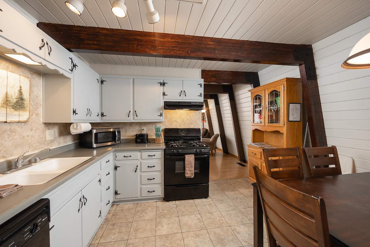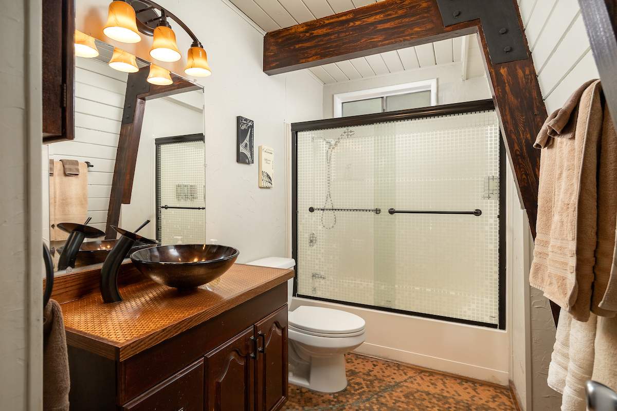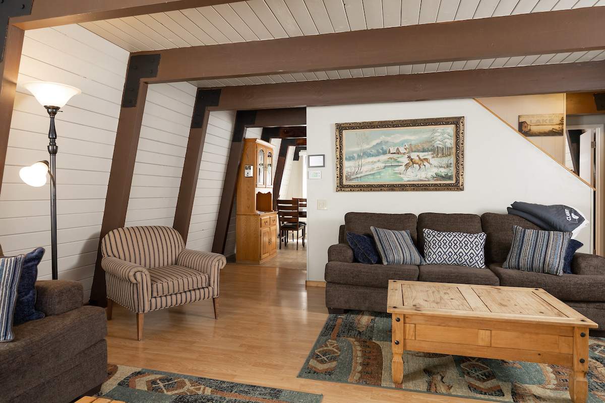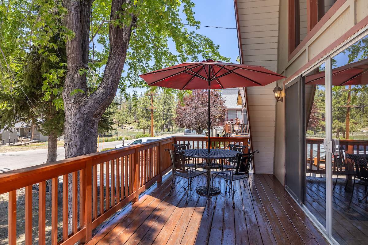 Awesome central Big Bear Lake location so close to the lake and less than one mile from the village. Popular full-roof gambrel-style cabin featuring high beamed ceilings, a cozy brick fireplace, and laminate flooring. Eat-in kitchen with all the amenities. Remodeled bathroom on main level with custom vanity and glass shower doors. Two bedrooms upstairs, one is loft-style. Newer central forced air furnace and water heater. Newly added high powered exhaust fan upstairs to keep cabin cool in the warm summer months. Enjoy the fresh mountain air out on the spacious redwood deck which surrounds the home on three sides. Easy all-season access and level parking. Has been a highly successful vacation rental. Turnkey and ready to enjoy today!