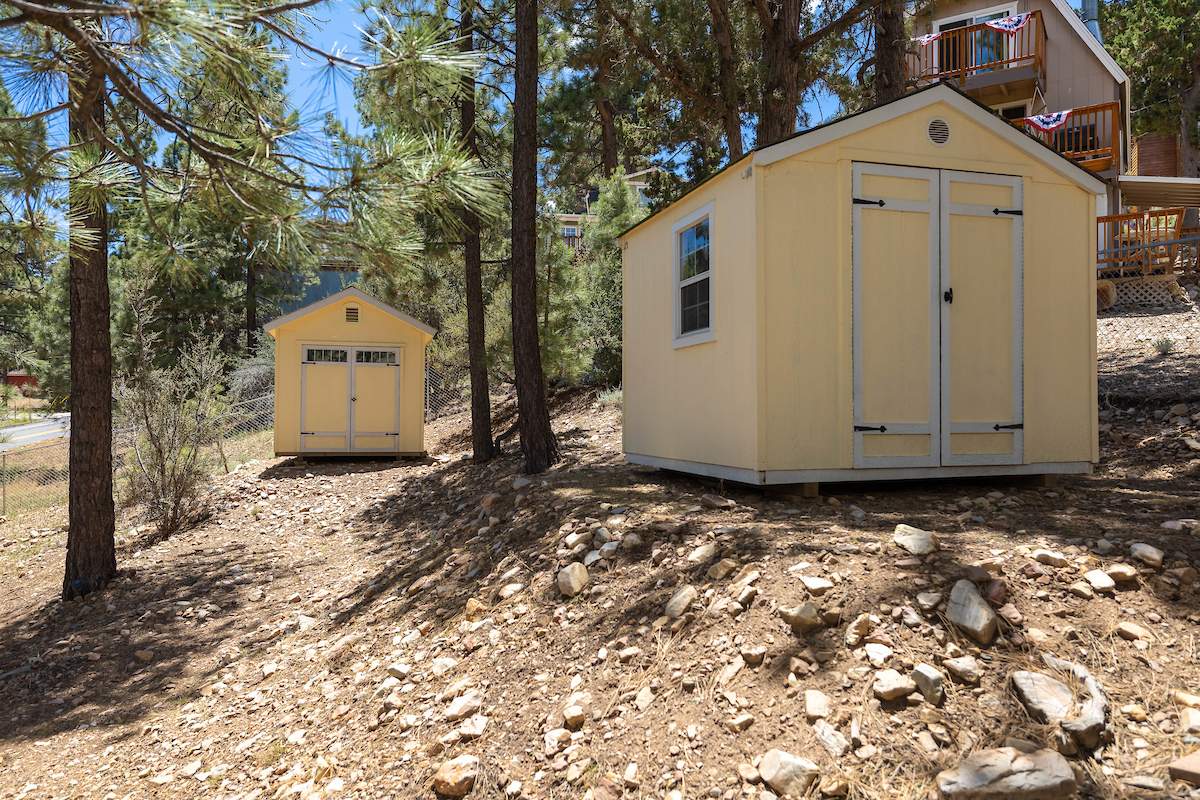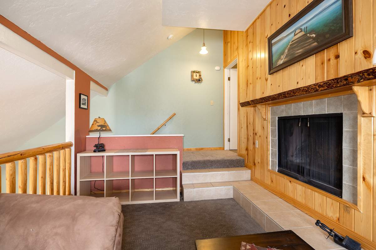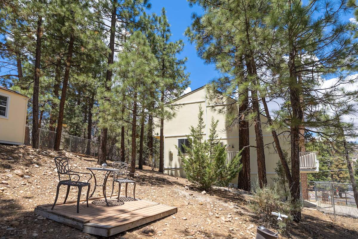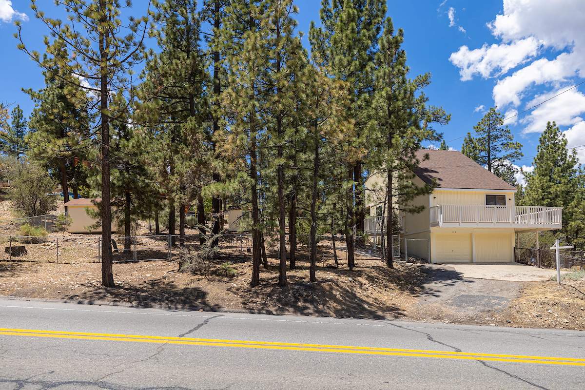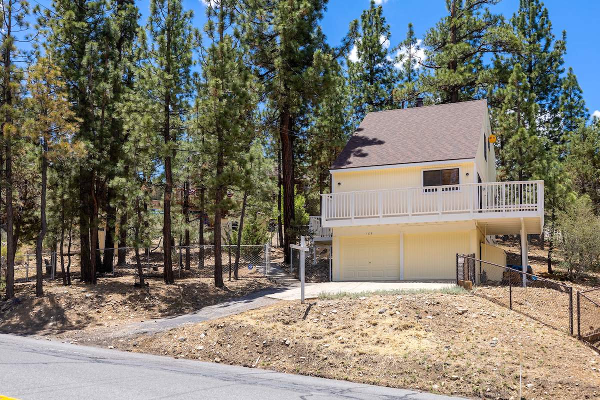 Enjoy treetop views and beautiful sunsets from this unique mountain home situated on a fenced 1/4 acre. Freshly painted exterior and new carpet on the stairs. Main level features vaulted ceilings, tile floors, and sunny wraparound deck off of the dining area. Updated kitchen has plenty of storage space. One bedroom and full bath on main level as well. Upper level features a loft style living room and adjacent master suite w/private balcony. Sprawling fenced yard and two quality storage sheds. Garage has laundry hookups inside. Would make a great weekend getaway and/or rental investment property.