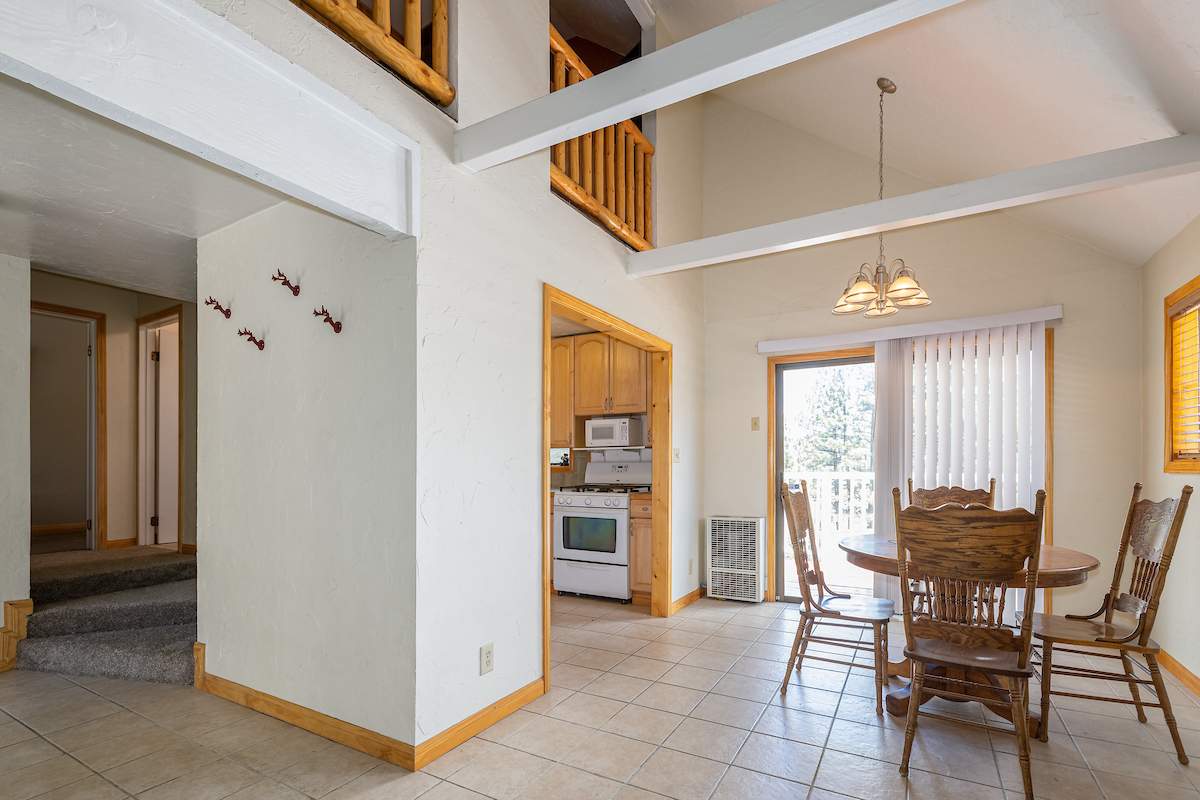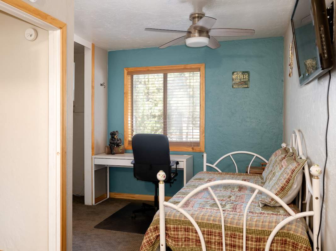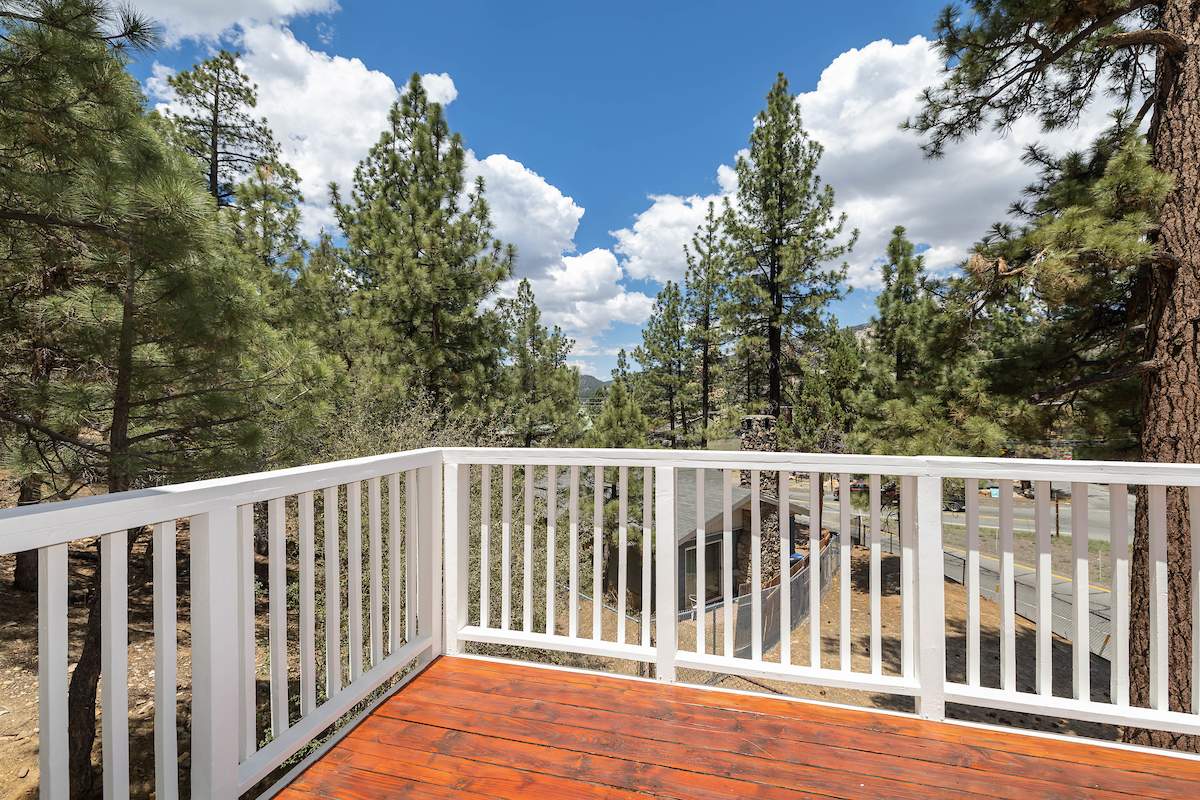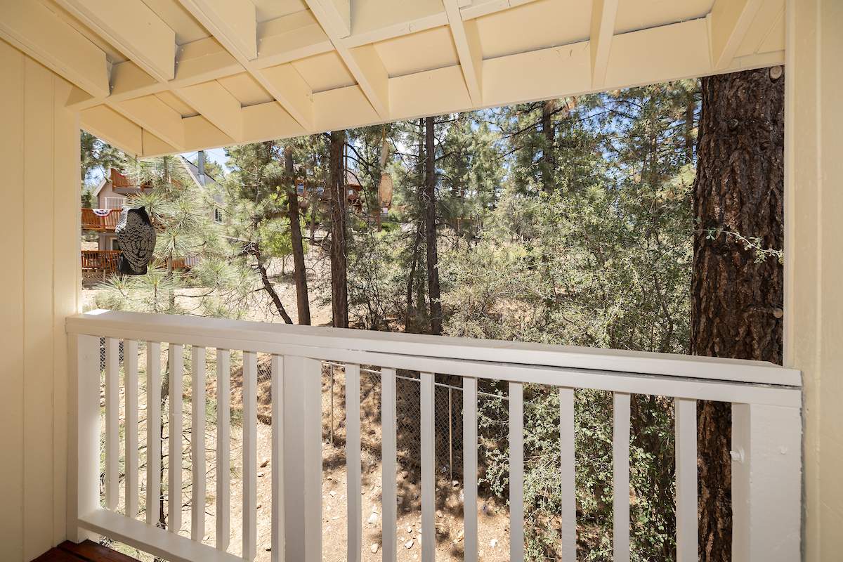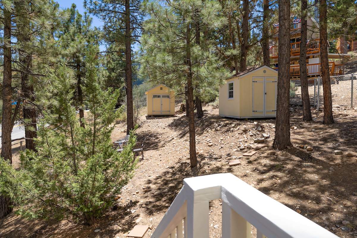 Enjoy treetop views and beautiful sunsets from this unique mountain home situated on a fenced 1/4 acre. Freshly painted exterior and new carpet on the stairs. Main level features vaulted ceilings, tile floors, and sunny wraparound deck off of the dining area. Updated kitchen has plenty of storage space. One bedroom and full bath on main level as well. Upper level features a loft style living room and adjacent master suite w/private balcony. Sprawling fenced yard and two quality storage sheds. Garage has laundry hookups inside. Would make a great weekend getaway and/or rental investment property.