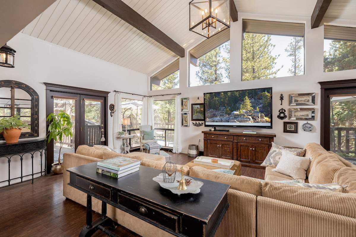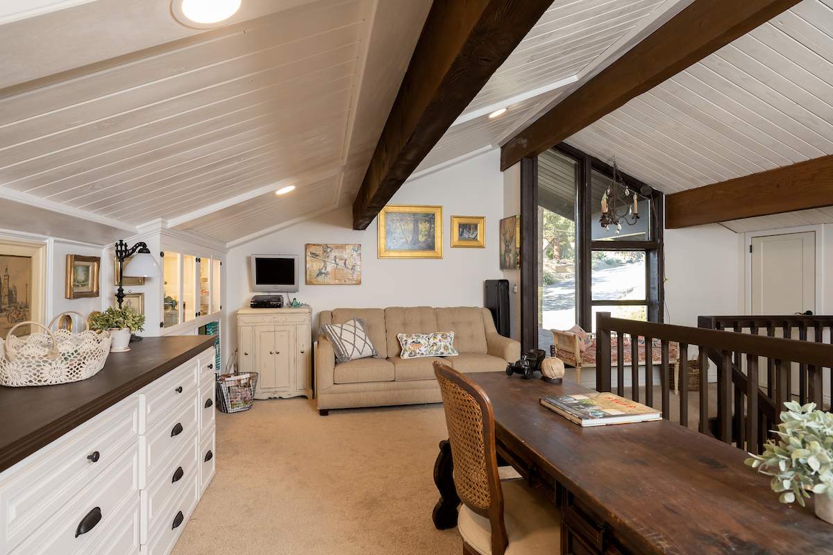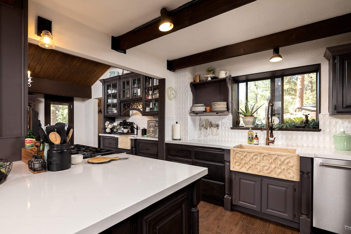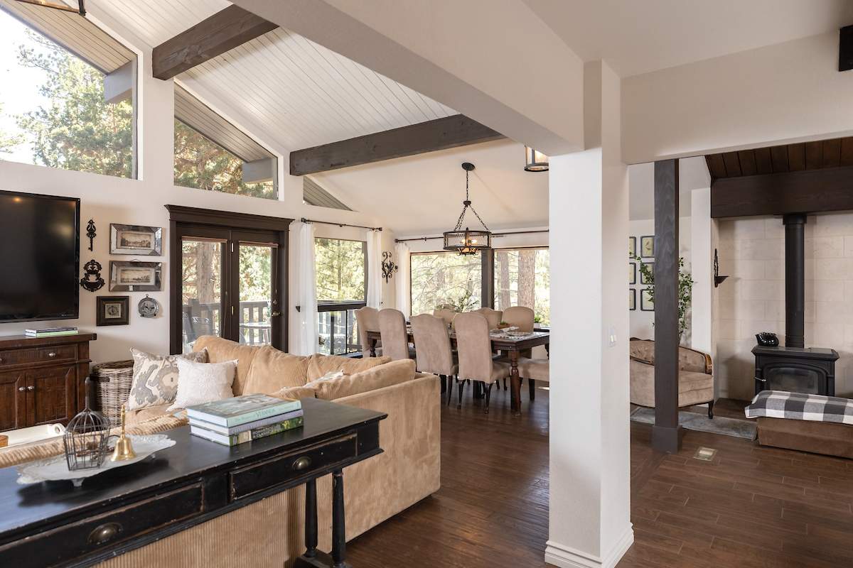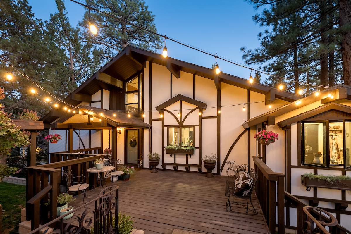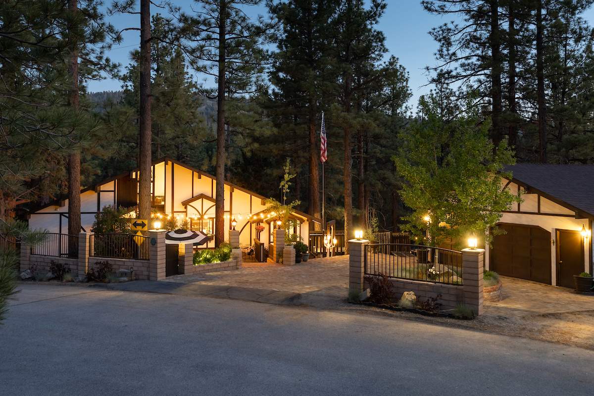 One-of-a-kind, Tudor mountain cabin in prime Fox Farm neighborhood on ½ acre lot, near lake, skiing and shopping. 5 bdrms + library/game rm loft w/custom built-ins, 4 full baths, sun-soaked bonus rm w/fireplace & large cedar paneled sauna. Wood beamed cathedral ceiling & oversized windows w/pine trees & partial ski slope views. Custom ($10k) coffee bar & butler’s pantry, solid hardwood floors, 3 handmade travertine farmhouse inlaid design sinks, quartz counters, bar seating for 6, breakfast nook, formal dining & cozy reading area w/wood stove. 3 decks, basketball court & natural stone driveway fits 8 cars. Oversized shed, 3-car garage w/workbench, full extension cabinets & sink. Plantation shutters & fireplace in master bdrm. Master bath w/Parisian style paneling & free standing tub. New custom lighting, baseboards, trim & solid core doors. 5 outdoor areas, custom English pergola garden w/fountain, 2 ski lift chair swings, fruit trees, views of torchlight parade & July 4th fireworks.