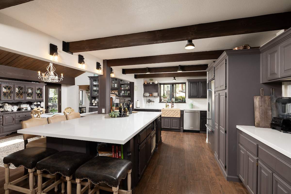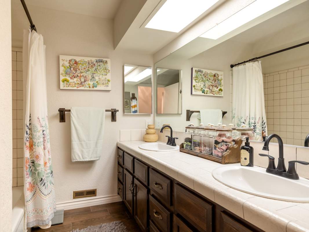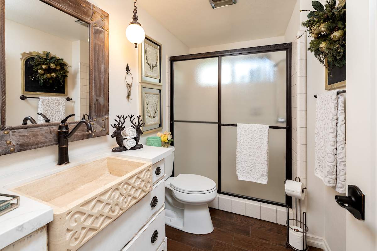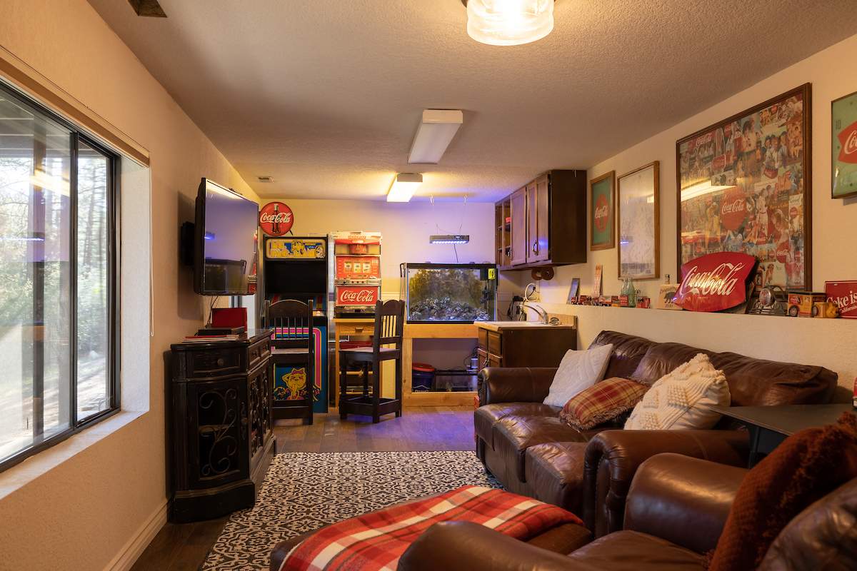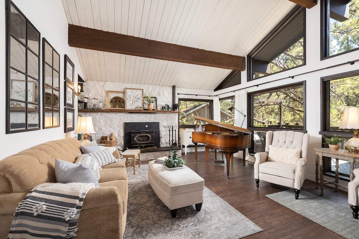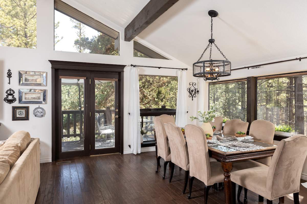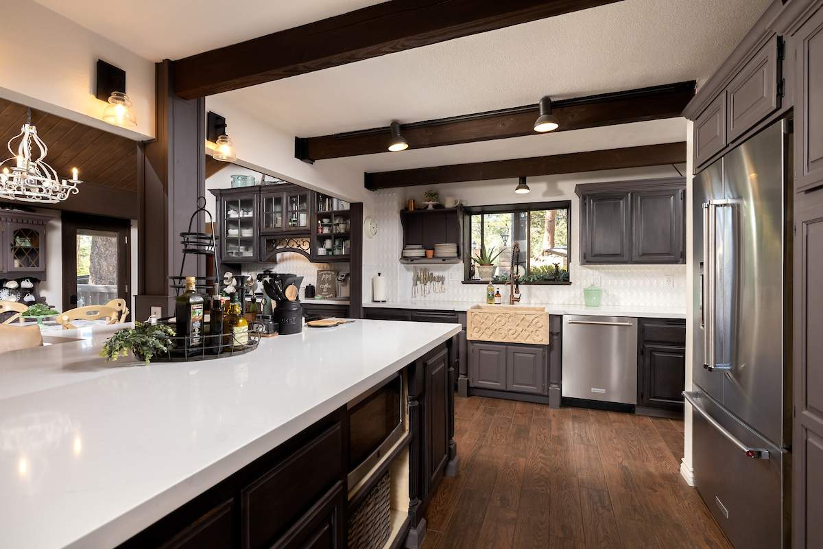 One-of-a-kind, Tudor mountain cabin in prime Fox Farm neighborhood on ½ acre lot, near lake, skiing and shopping. 5 bdrms + library/game rm loft w/custom built-ins, 4 full baths, sun-soaked bonus rm w/fireplace & large cedar paneled sauna. Wood beamed cathedral ceiling & oversized windows w/pine trees & partial ski slope views. Custom ($10k) coffee bar & butler’s pantry, solid hardwood floors, 3 handmade travertine farmhouse inlaid design sinks, quartz counters, bar seating for 6, breakfast nook, formal dining & cozy reading area w/wood stove. 3 decks, basketball court & natural stone driveway fits 8 cars. Oversized shed, 3-car garage w/workbench, full extension cabinets & sink. Plantation shutters & fireplace in master bdrm. Master bath w/Parisian style paneling & free standing tub. New custom lighting, baseboards, trim & solid core doors. 5 outdoor areas, custom English pergola garden w/fountain, 2 ski lift chair swings, fruit trees, views of torchlight parade & July 4th fireworks.