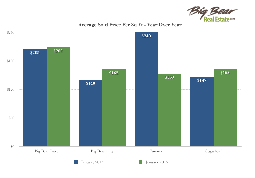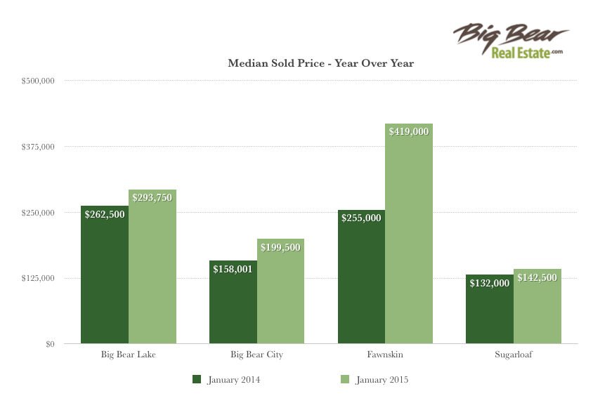 There is a continuing trend of rising property values in the Big Bear area. The median sales price of single family homes in January increased by 9% compared to the previous month and is 31% higher than it was in January of last year. Average sales price is up 20% from January 2014. Property values increased year over year in all four zip codes in Big Bear. It was forecasted by the California Association of Realtors that property values across the state will continue to rise this year and next.