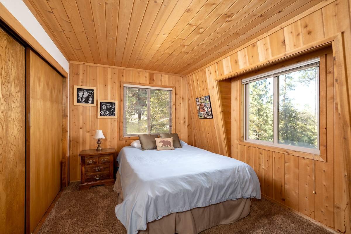 Nestled in the oaks and pines in a sought-after Moonridge location near Bear Mountain, the lake, forest and everything else Big Bear has to offer. This tree house has room for a crowd with 5 bedrooms, 2 full baths, and laundry. Classic gambrel-style has that true mountain cabin feel with beamed ceilings and lots of wood T&G. Cozy brick fireplace with efficient wood-burning stove will warm you right up after a long day on the slopes. Kitchen features custom cabinetry, a dining area and pantry. Enjoy the treed surroundings out on the wraparound deck and gaze at the stars while soaking in the private spa. Capable of accommodating a large family or group, this home will make an awesome weekend getaway and/or income-producing vacation rental investment.