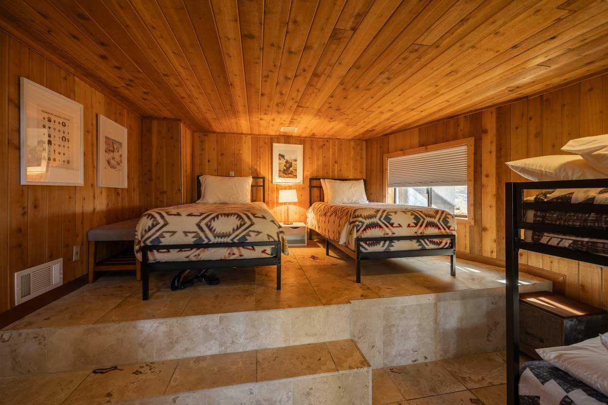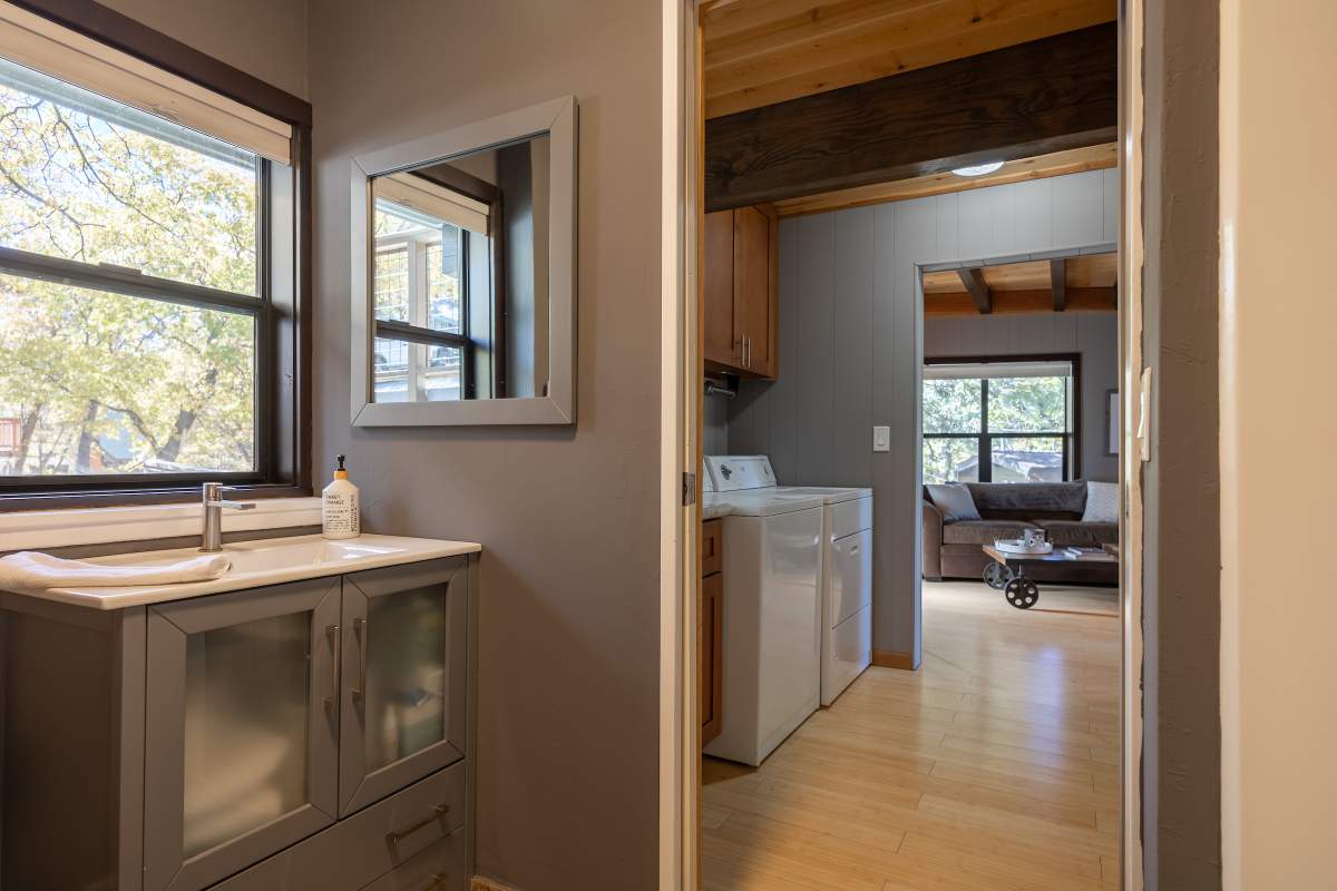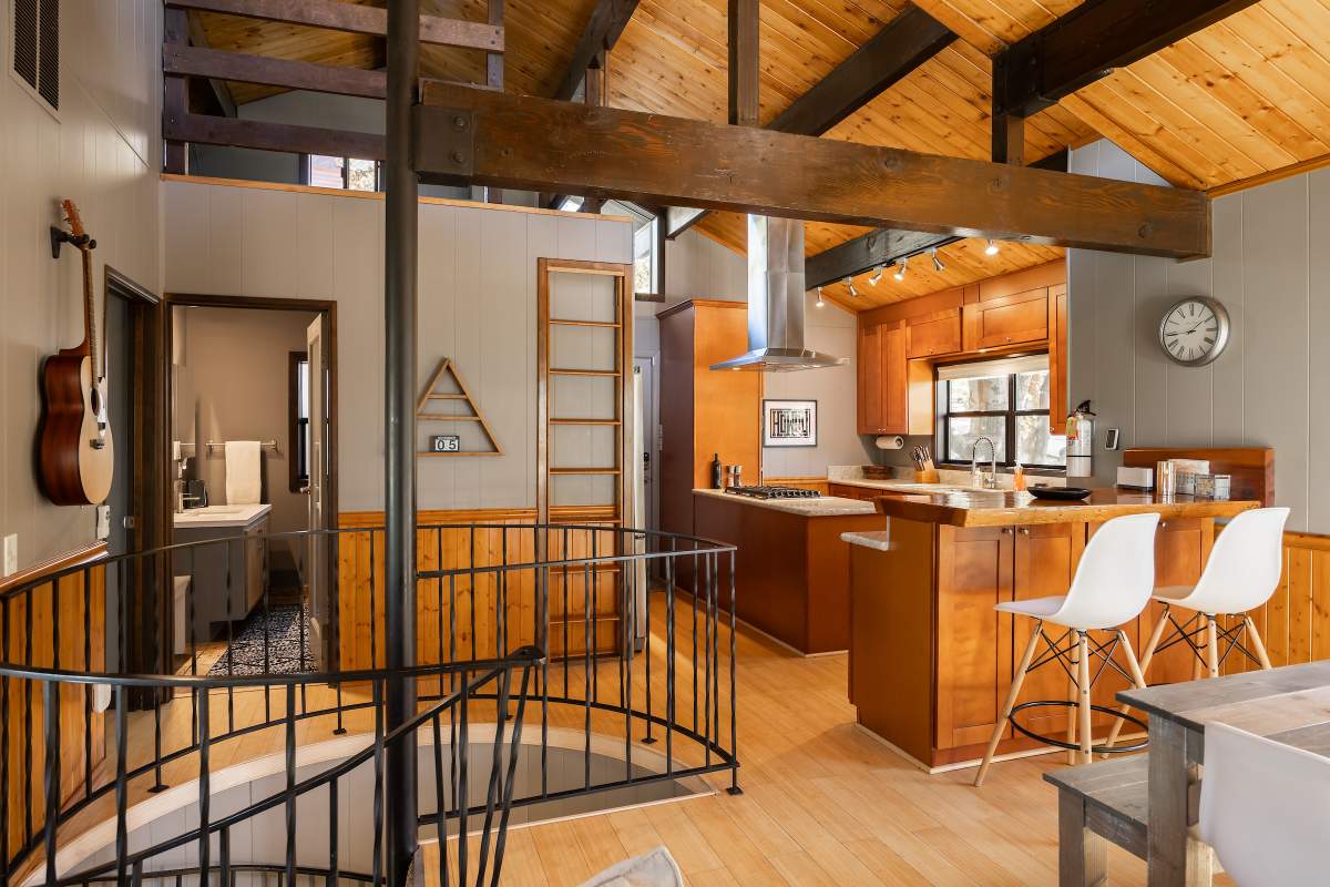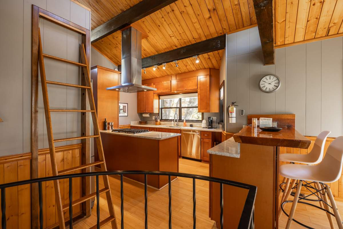 Perfectly positioned amongst the oaks and pines in upper Moonridge, this modern rustic tree house is truly something special. Intriguing architectural design and multi-level decking allow for intimate outdoor living, distant mountain views, and a feeling of serenity and seclusion. This cabin has been superbly remodeled with updates including a new roof, black aluminum Milgard windows and patio doors, siding, paint, completely rebuilt decking and entryways, and level concrete parking for 3-4 vehicles. All new furnishings and window coverings including an Aurhus sofa and Sleep Number bed, new A/C unit, and water heater. Main level living area features beamed ceilings, river rock fireplace, wainscoting, ceiling fan, a small loft, and deck access. The gorgeous kitchen offers abundant custom cabinetry, granite, high-end stainless appliances, an island with gas range and vented hood, new gas stove, wine fridge, a breakfast bar, and adjacent dining area. Middle level has second living area/family/game room with efficient wood stove, second bedroom, and bath, and access to deck and spa. Lower level offers a spacious third bedroom with custom tile flooring, sitting area, and access to the backyard. The sprawling 1/4 acre lot is awesome for winter snow play; would make a fantastic vacation rental. Enjoy the tree-lined street with the joy of the changing seasons on display, and views of the ski slopes revealed when the leaves fall away. Go experience this enchanting property today.