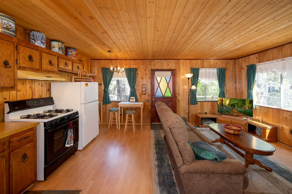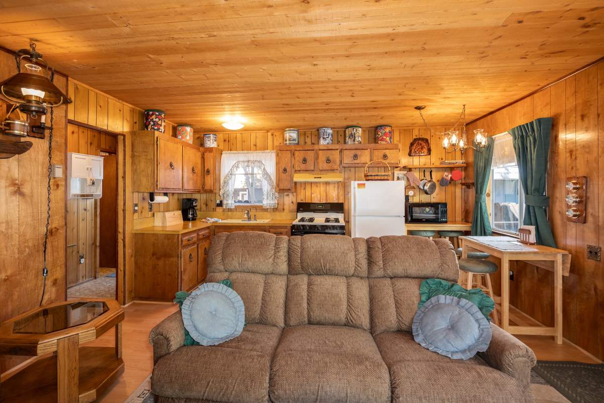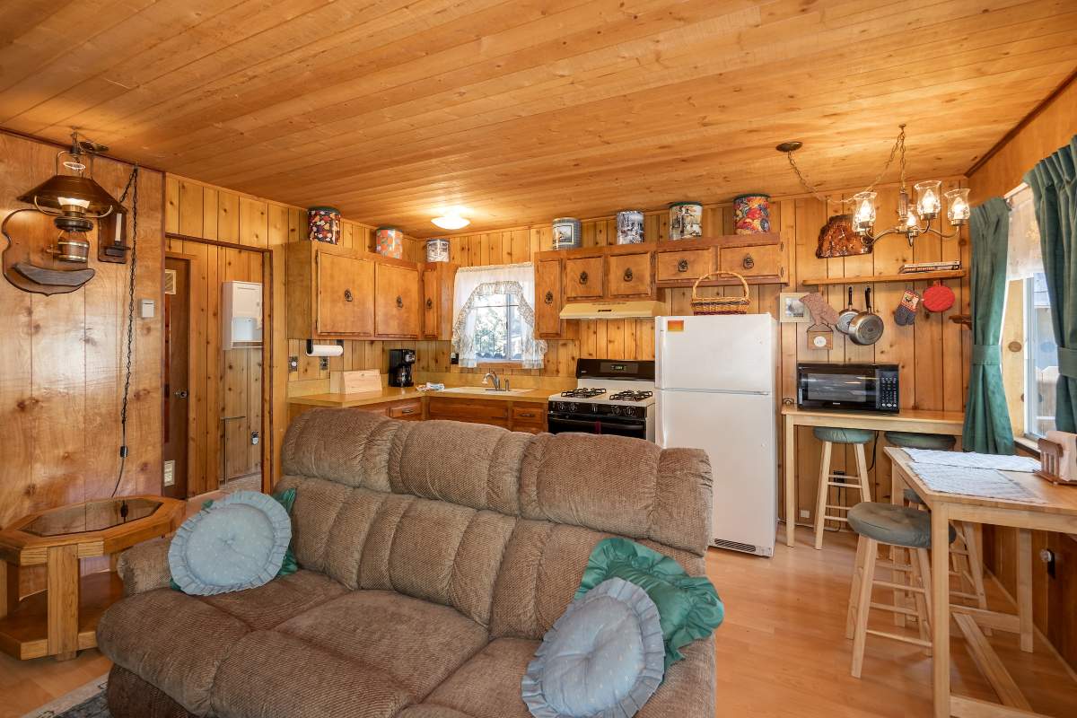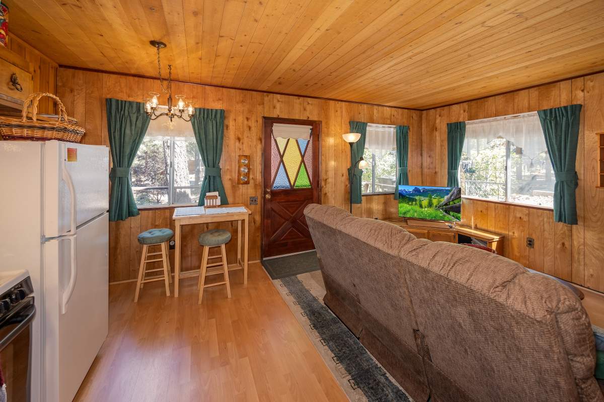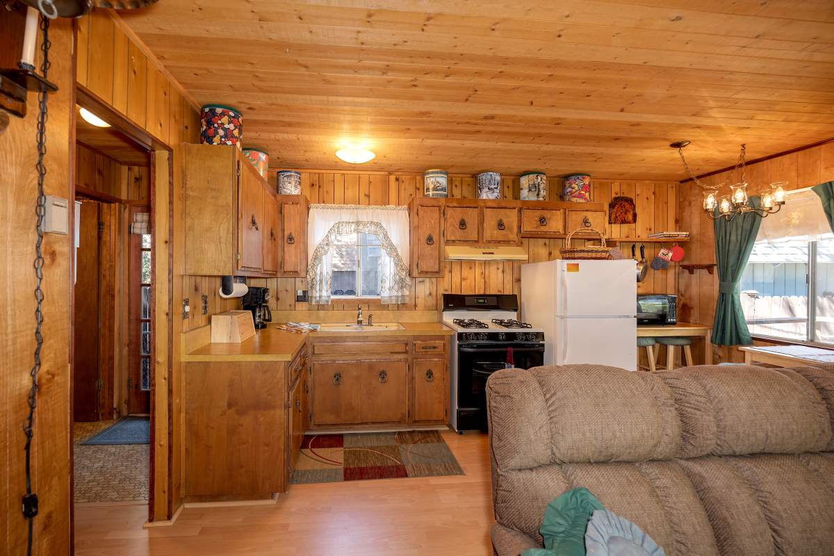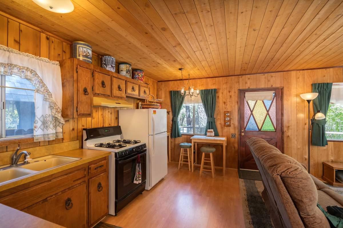 This charming chalet feels like a doll house and is a shining example of what makes tiny cabins so popular. Wonderfully situated set back from the street on a well-treed, fully fenced lot. Beautifully maintained and features woodsy T&G ceilings, laminate flooring, a cozy corner rock fireplace with wood stove insert. Efficient use of the single-level living space with an open floor plan, kitchen offers plenty of cabinet storage and dining area. Peaceful front yard and back yard, complete with a storage shed. Even has laundry hookups. Don’t let this one get away.