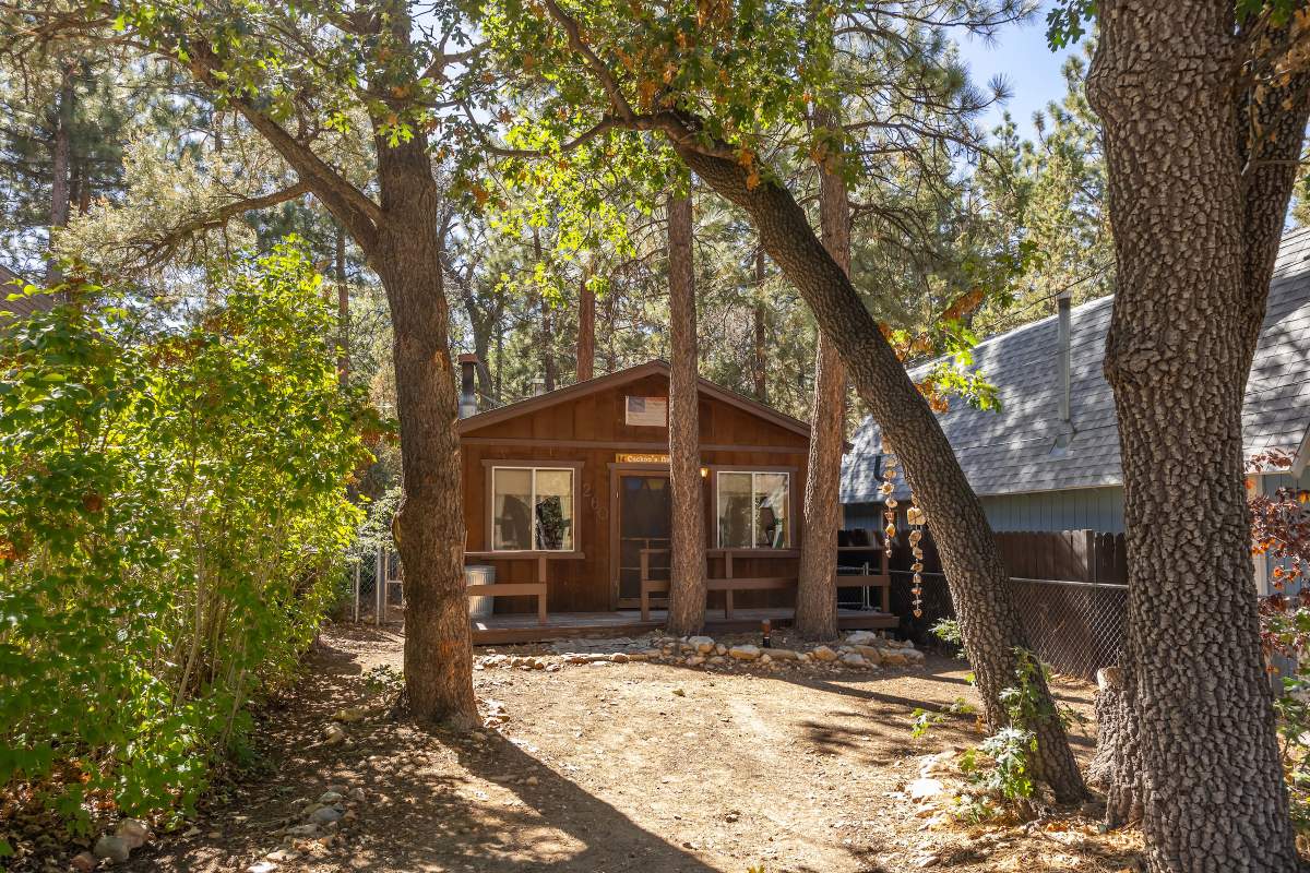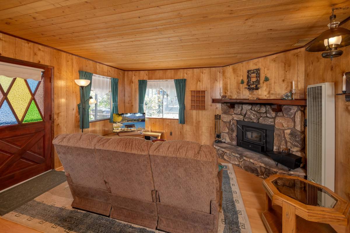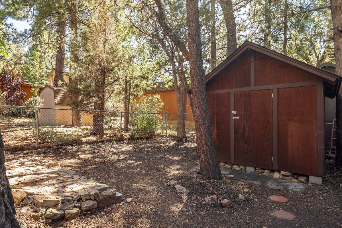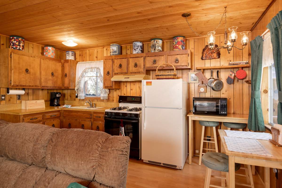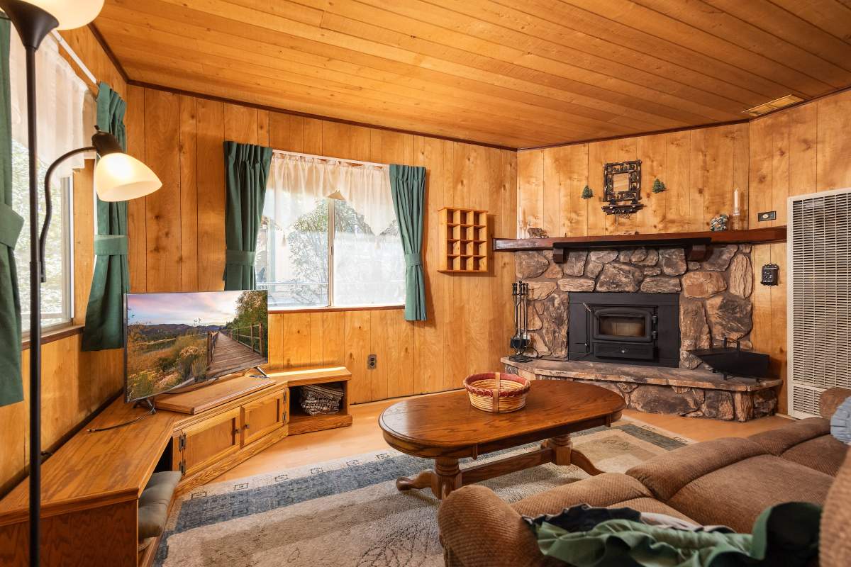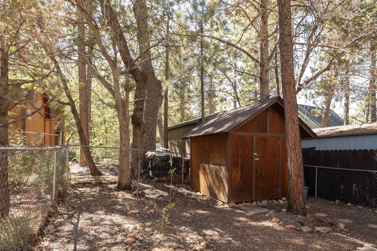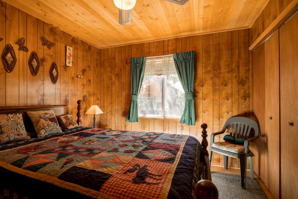 This charming chalet feels like a doll house and is a shining example of what makes tiny cabins so popular. Wonderfully situated set back from the street on a well-treed, fully fenced lot. Beautifully maintained and features woodsy T&G ceilings, laminate flooring, a cozy corner rock fireplace with wood stove insert. Efficient use of the single-level living space with an open floor plan, kitchen offers plenty of cabinet storage and dining area. Peaceful front yard and back yard, complete with a storage shed. Even has laundry hookups. Don’t let this one get away.