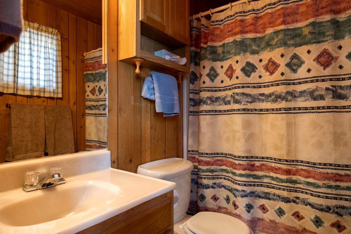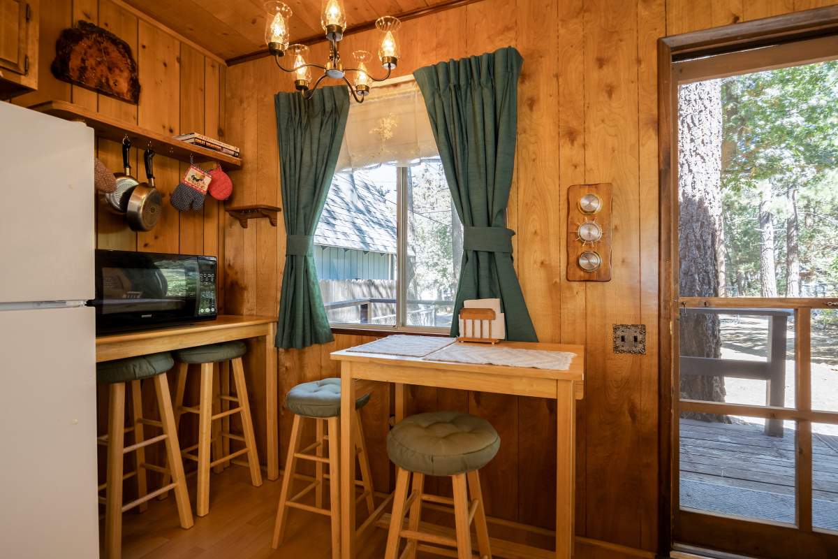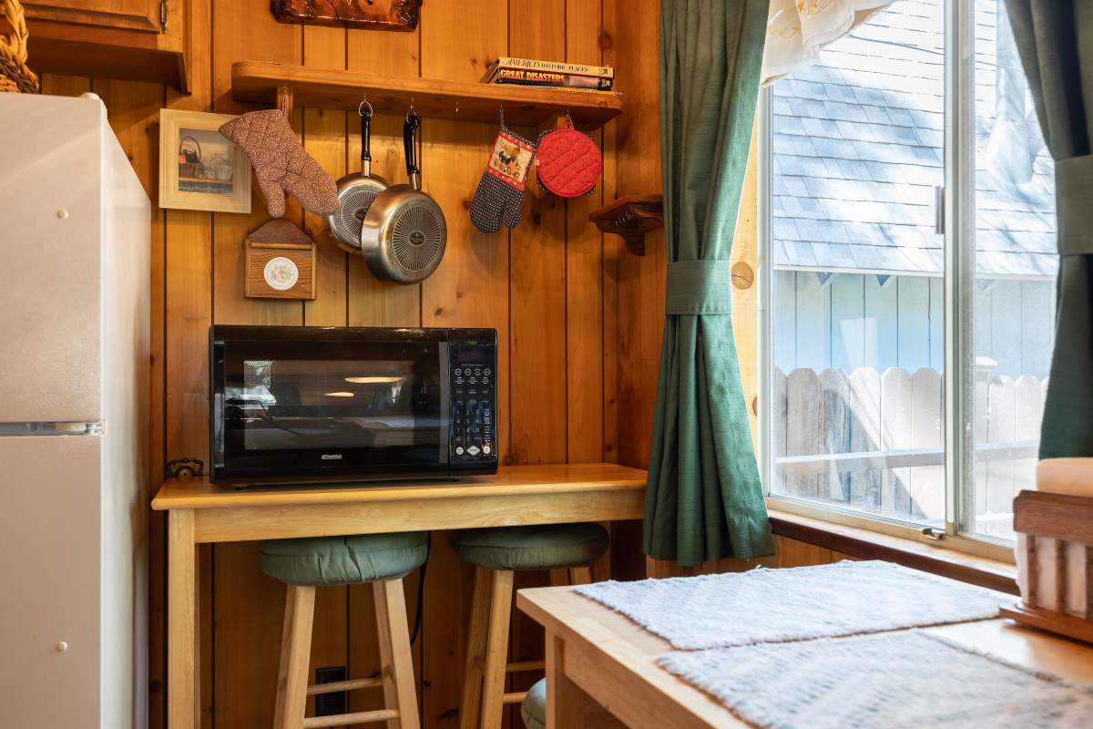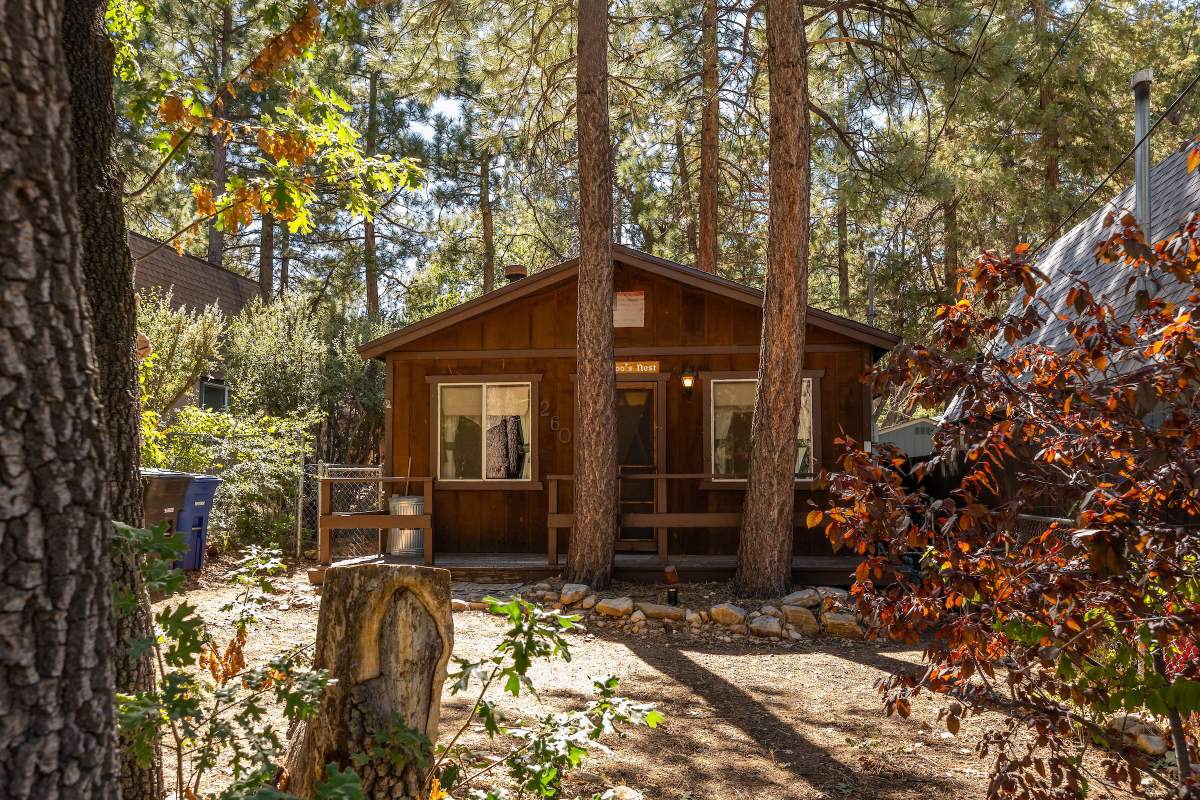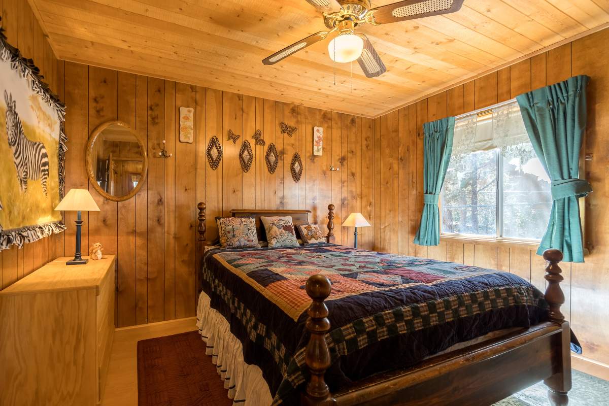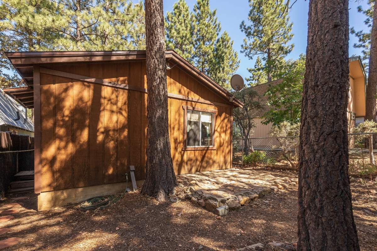 This charming chalet feels like a doll house and is a shining example of what makes tiny cabins so popular. Wonderfully situated set back from the street on a well-treed, fully fenced lot. Beautifully maintained and features woodsy T&G ceilings, laminate flooring, a cozy corner rock fireplace with wood stove insert. Efficient use of the single-level living space with an open floor plan, kitchen offers plenty of cabinet storage and dining area. Peaceful front yard and back yard, complete with a storage shed. Even has laundry hookups. Don’t let this one get away.